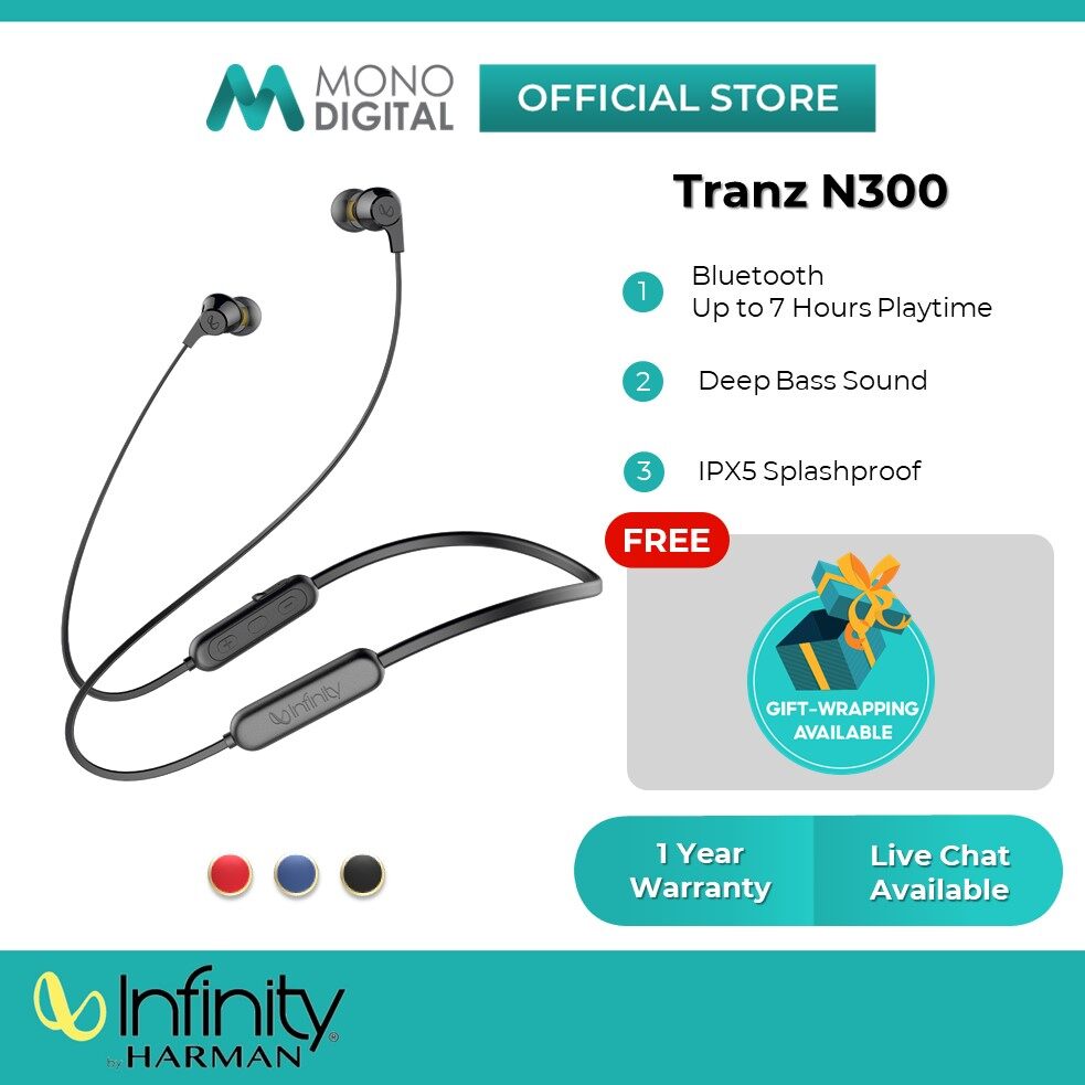 ***Infinity by Harman Tranz N300 Wireless Bluetooth in Earphone Neckband with Mic *** The lightweight Tranz N300 wireless neckband is the perfect companion for your everyday musical needs. Developed using the unique Strongram design technique, this feather-light & flexible yet rugged Bluetooth neckband is tough and at the same time feels weightless around the neck. The Advanced Acoustic Anechoic Earpiece design, with angular tube for clear audio delivery, ensures top quality music with deep bass sound & a perfect fit. The Dual Equalizer feature further adds to the enhanced music quality and helps you switch between normal music mode and deep bass mode effortlessly. With up to 7 hours of playtime and IPX5 sweat resistant technology, Tranz N300 drives a party in your ears throughout the day. The magnetic earbuds clip easily to each other, securing itself around the neck, so you don’t have to worry about dropping or damaging them. The 3 button remote lets you play, pause, skip and quickly access the voice assistant feature, even when your phone is away. General SpecificationsDimensionsControl and Connection SpecificationsFeaturesUp to 7 hours music playtimeNo more plug-point hunting! Enjoy your music all day long with no interruptions Dual EQPush the Vol+ and Vol- buttons together to and get the best out of all your playlists Hands-free calling with 3 button remotePause, play, skip and pick a call. Everything in a push of a button Comfort fitFeel the beats, not the device. The comfortable fit of the earphones Deep Bass SoundEnjoy an immersive musical; experience with enhanced bass delivery 9 mm DriverEnjoy the best quality sound, no matter what music you play Google Now & Siri accesCheck the weather, know the score, pick calls, play your favorite playlist and much more with a button-push access to your voice assistants |