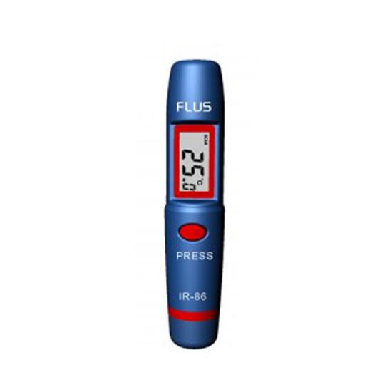 This is a pen-type infrared thermometer with a durable body. It comes in dark blue with red accents and a red button. The big-digit display allows users to read the measuring data with ease.