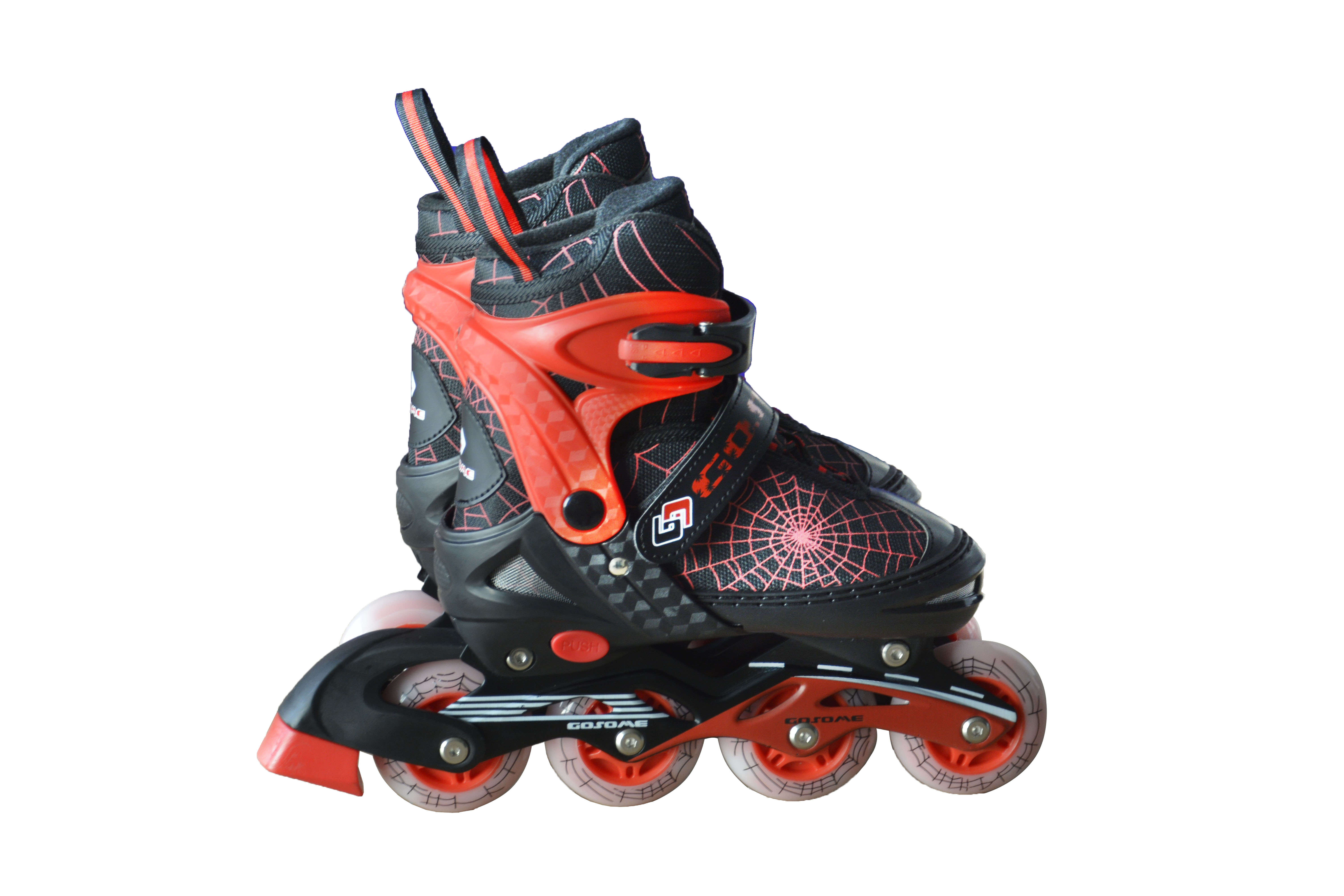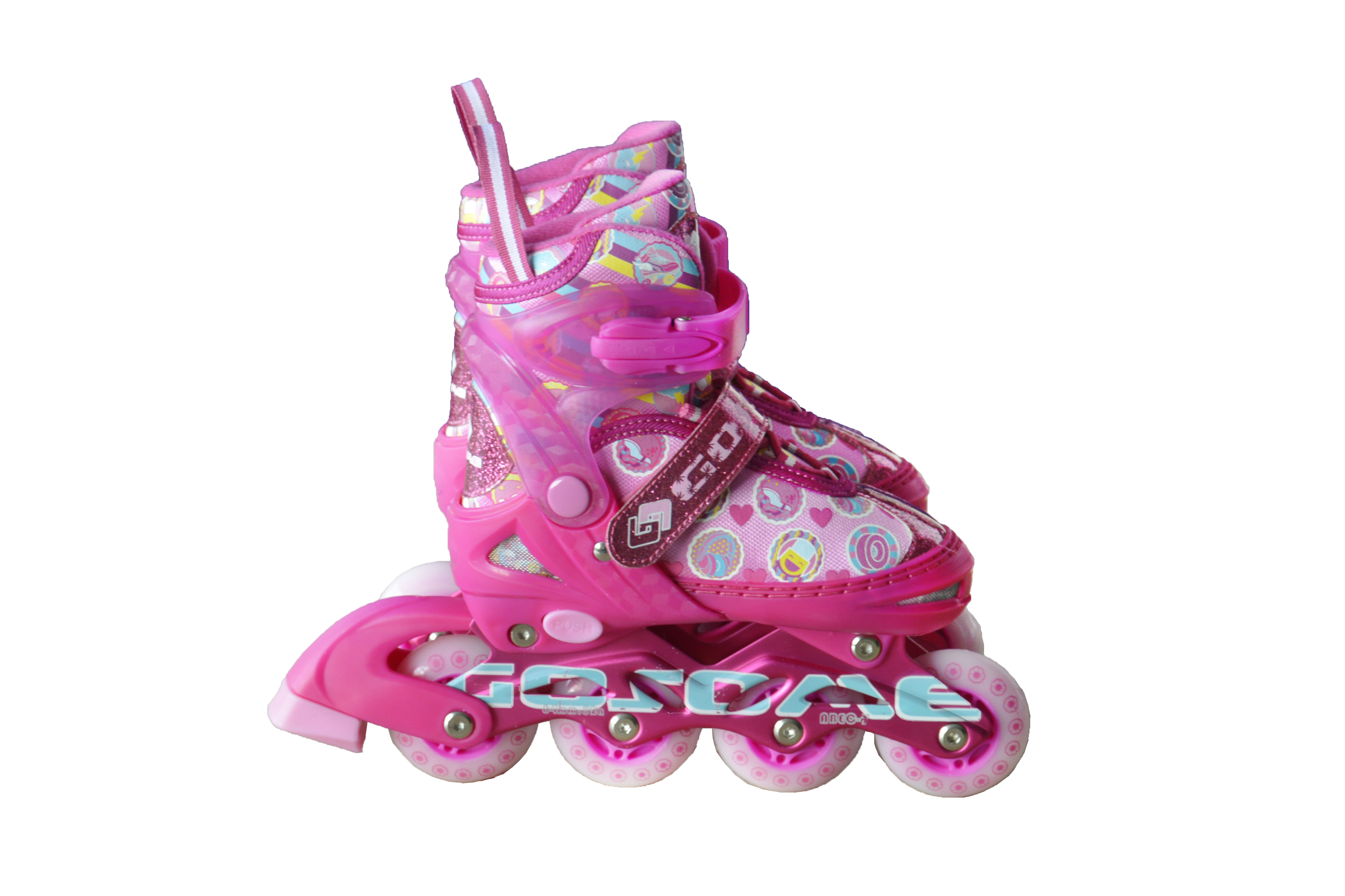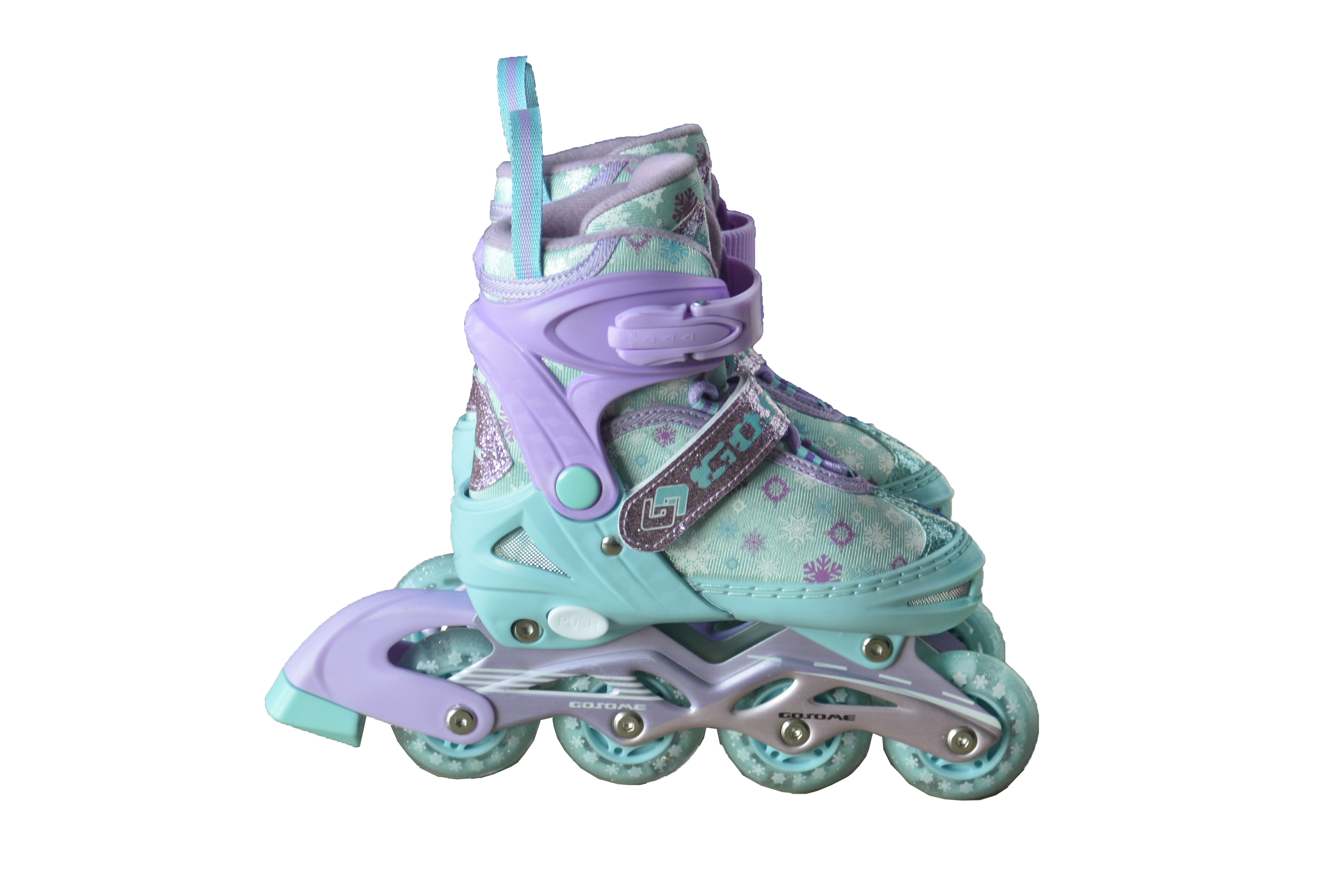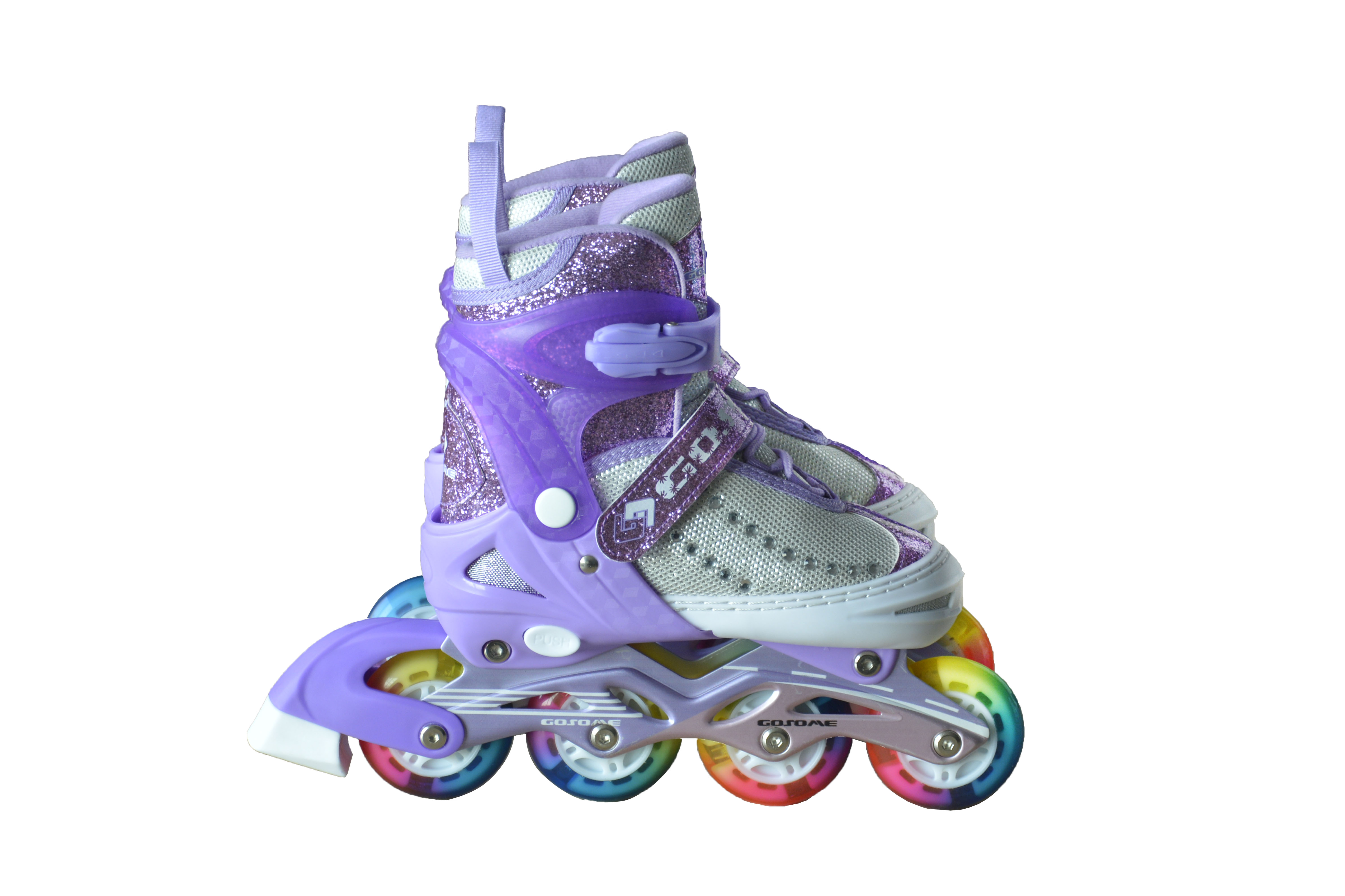 这里展示的是一双具有保护设计的内线滑冰鞋。车轮是用高回弹聚氨酯材料制成的。这双内线滑冰鞋容易调整和舒适穿。