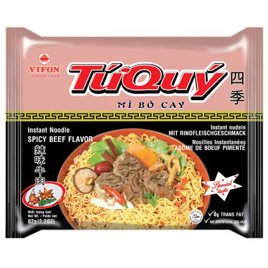 This displayed pack of noodles highlights a spicy beef flavor. The noodles can be cooked and served in minutes. The spicy flavors remind you of the authentic taste of mi bo cay in Vietnam.