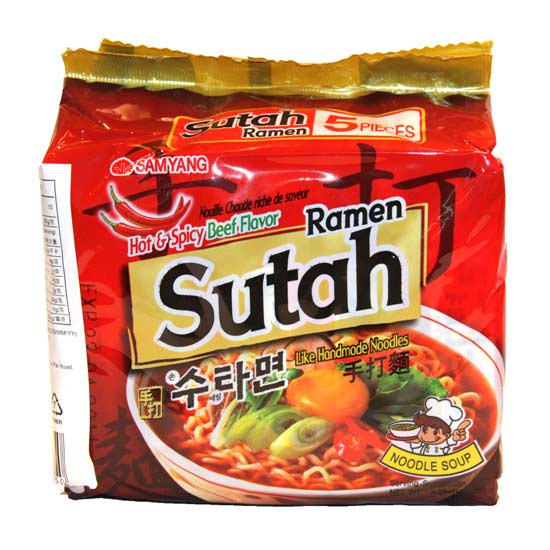 Featured here is a pack of instant noodles with eye-catching packaging. It features a spicy beef flavor. Prepare dishes with these instant noodles.