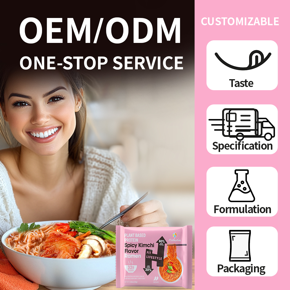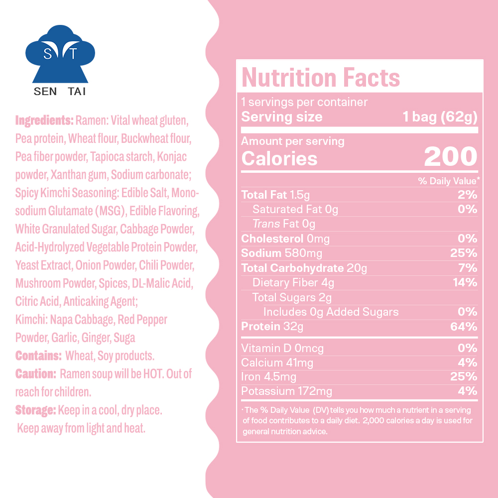 Ramen: Vital wheat gluten, Pea protein, Wheat flour, Buckwheat flour, Pea fiber powder, Tapioca starch, Konjac powder, Xanthan gum, Sodium carbonate.