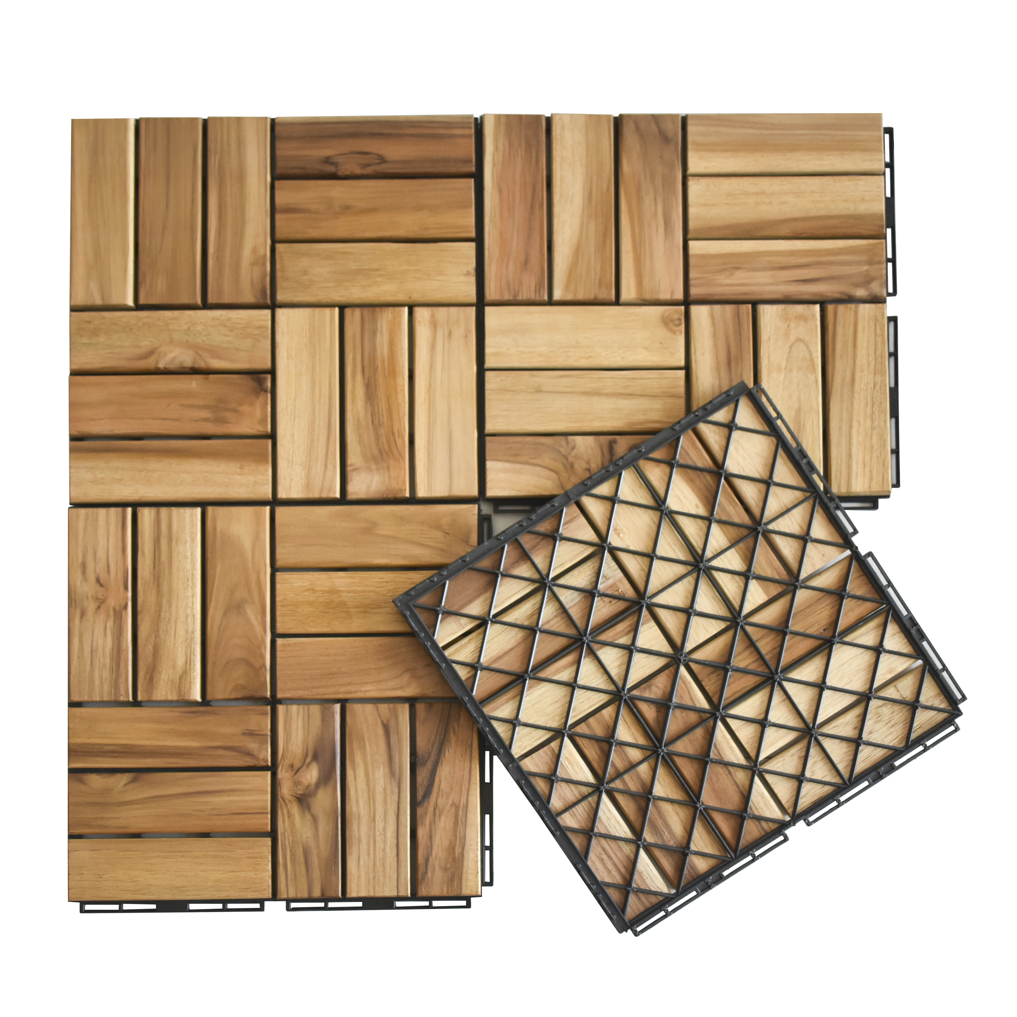 Made of solid acacia wood, these weather-resistant and highly durable decking tiles can have a long service life.