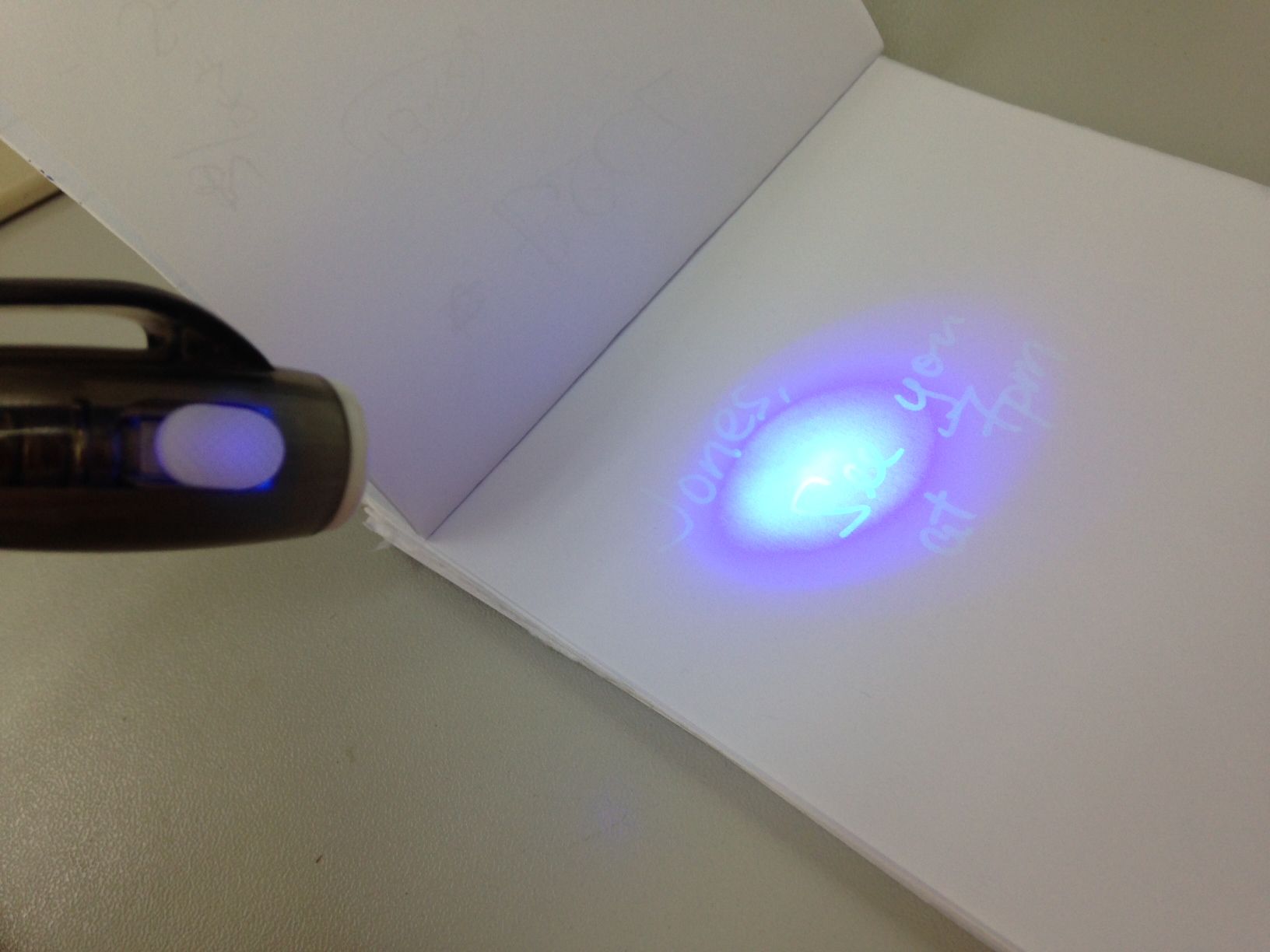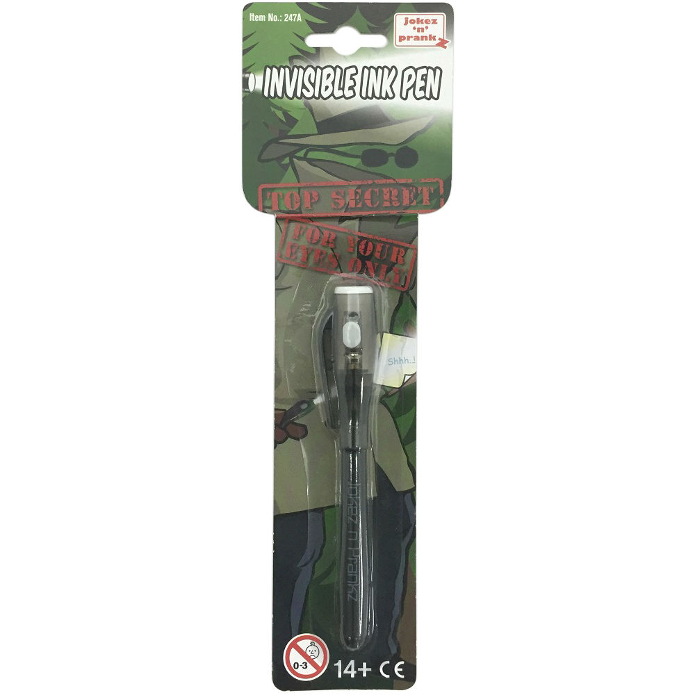 Invisible Ink Pen allows one to write the secret message on the note, and the key to "unlock" the words is the cap of the pen, there is a special light which allows the secret words to show themselves.