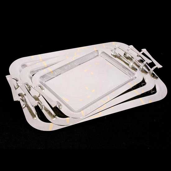 Featured here is an iron nickel plated tray set with subtle genuine gold patterns. The set includes trays of three different sizes to meet different needs. The trays highlight delicately crafted handles on both sides.