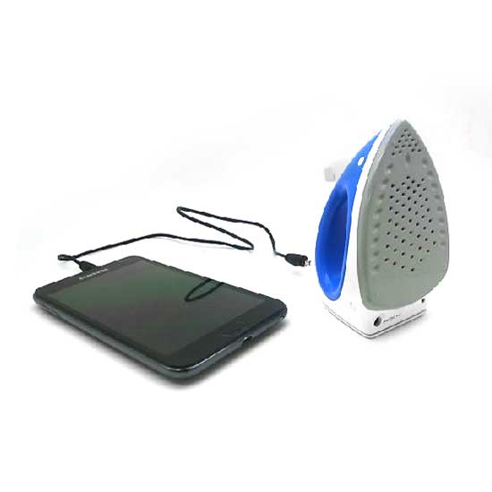 This mobile phone speaker features an iron-shaped design for a novel touch. It uses 2 AA-sized batteries to operate. This attractive phone speaker is a smart gift choice.