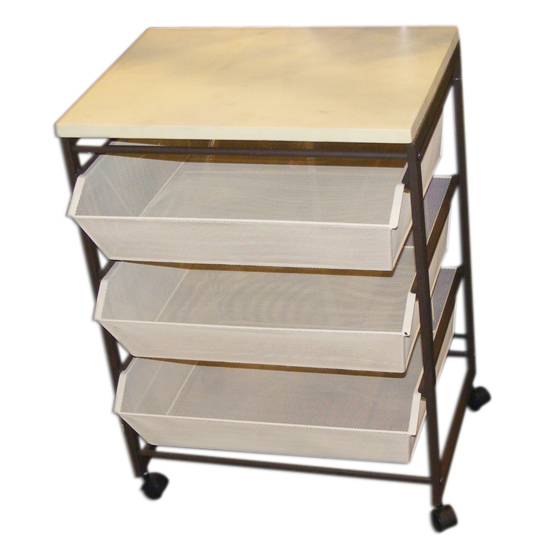 This particular shelf is made from durable iron with a total of three levels, each level has a special designed cloth drawer and wheels are attached on the bottom for easy moving.