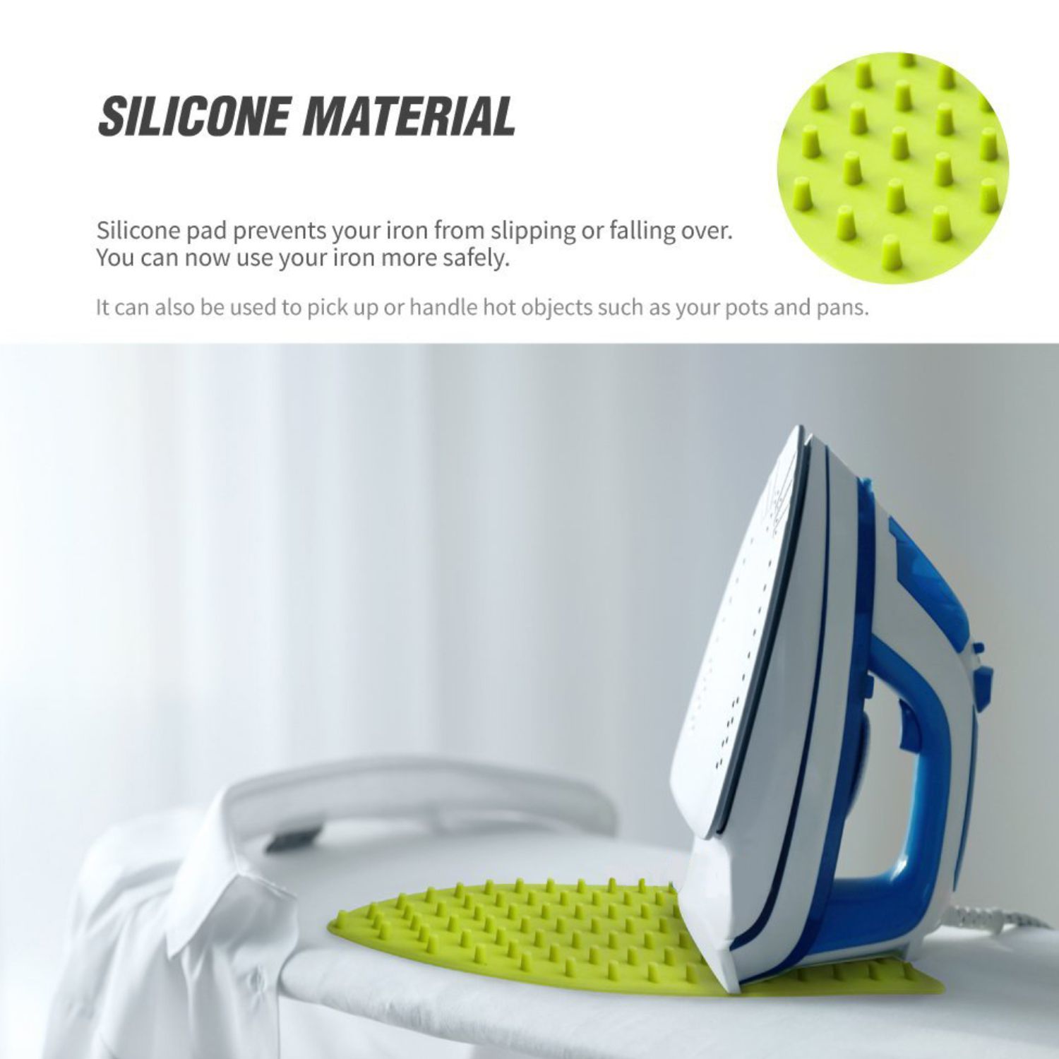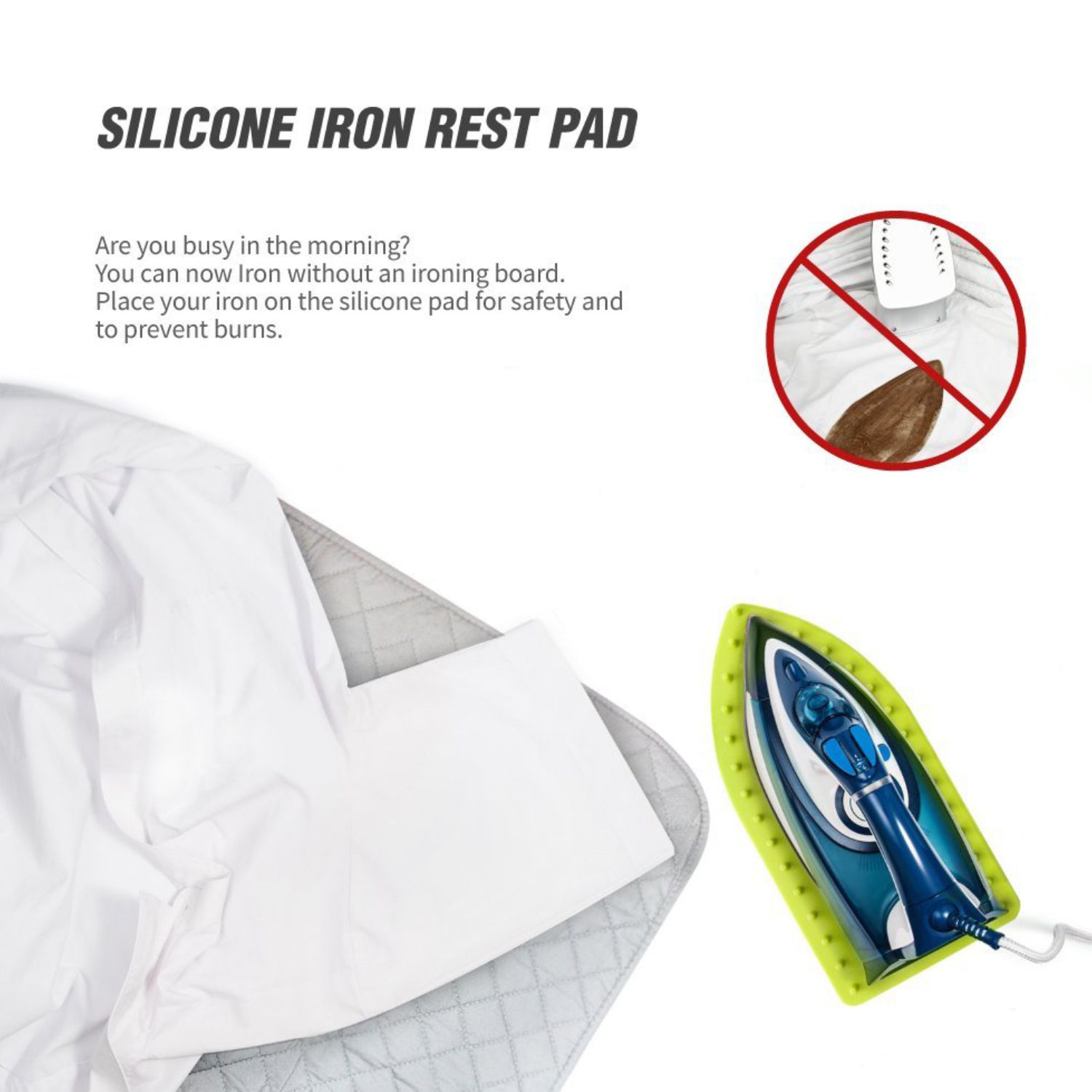 PROTECT SURFACES: Protect surfaces from your hot iron! Prevent burn spots on your ironing board/mat or even your carpet. Silicone pad also helps prevent scratches on your iron.