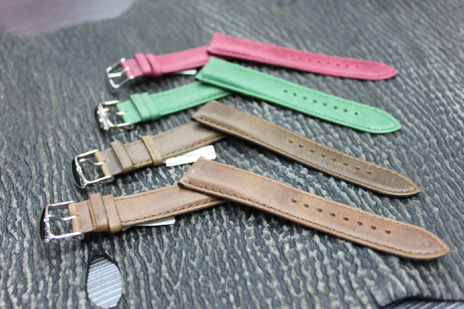 This Italian calf leather strap showcases a long, flat contour with stitched edges. The pointed end slips through a thumbnail buckle with a pin for a secure fit. This calf leather strap offers a sturdy and trendy alternative to your favorite timepiece.