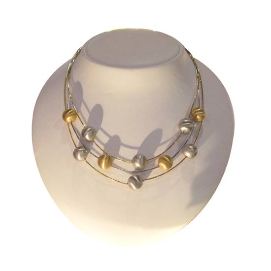 This princess-length necklace is made of 925 silver. It has 10 rhodium and gold plated ball ornaments that are strung on three slender chains in silver and gold color.