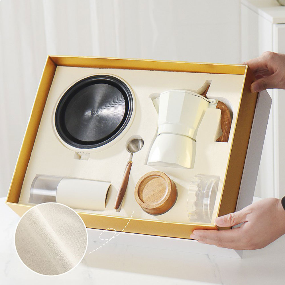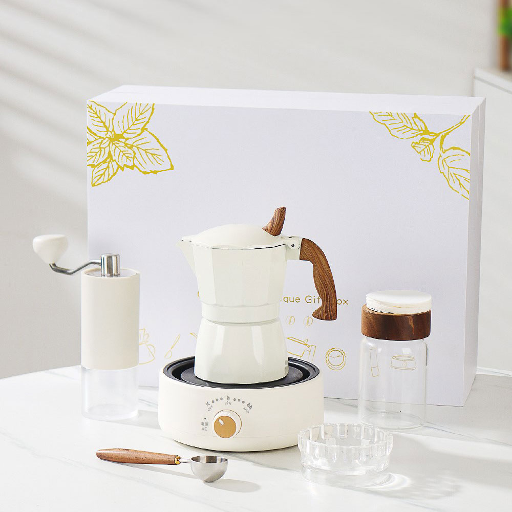 Moka pot*1,Coffee grinder*1,Bean jar*1,Electric stove*1,Filter paper,Distribution tool*1,Coffee Spoon*1