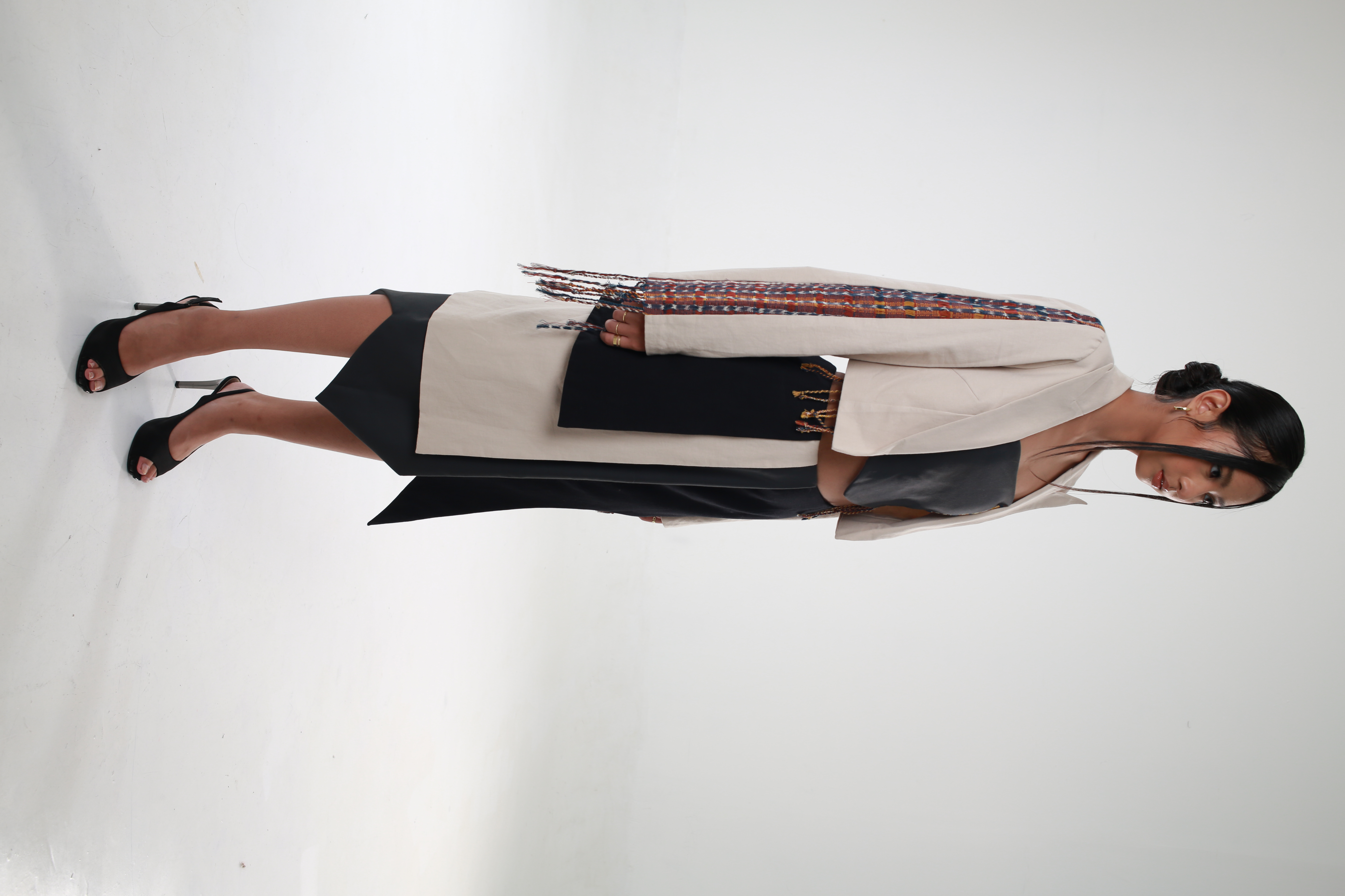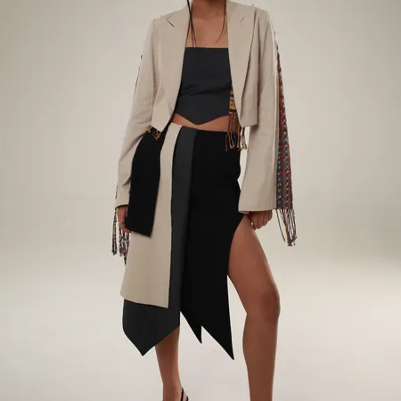 JESSLYN CRYSTALIAJC/SS/TAS/TTA three-toned asymmetrical skirt that brings bold contrast and movement to your wardrobe.