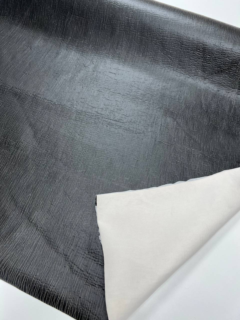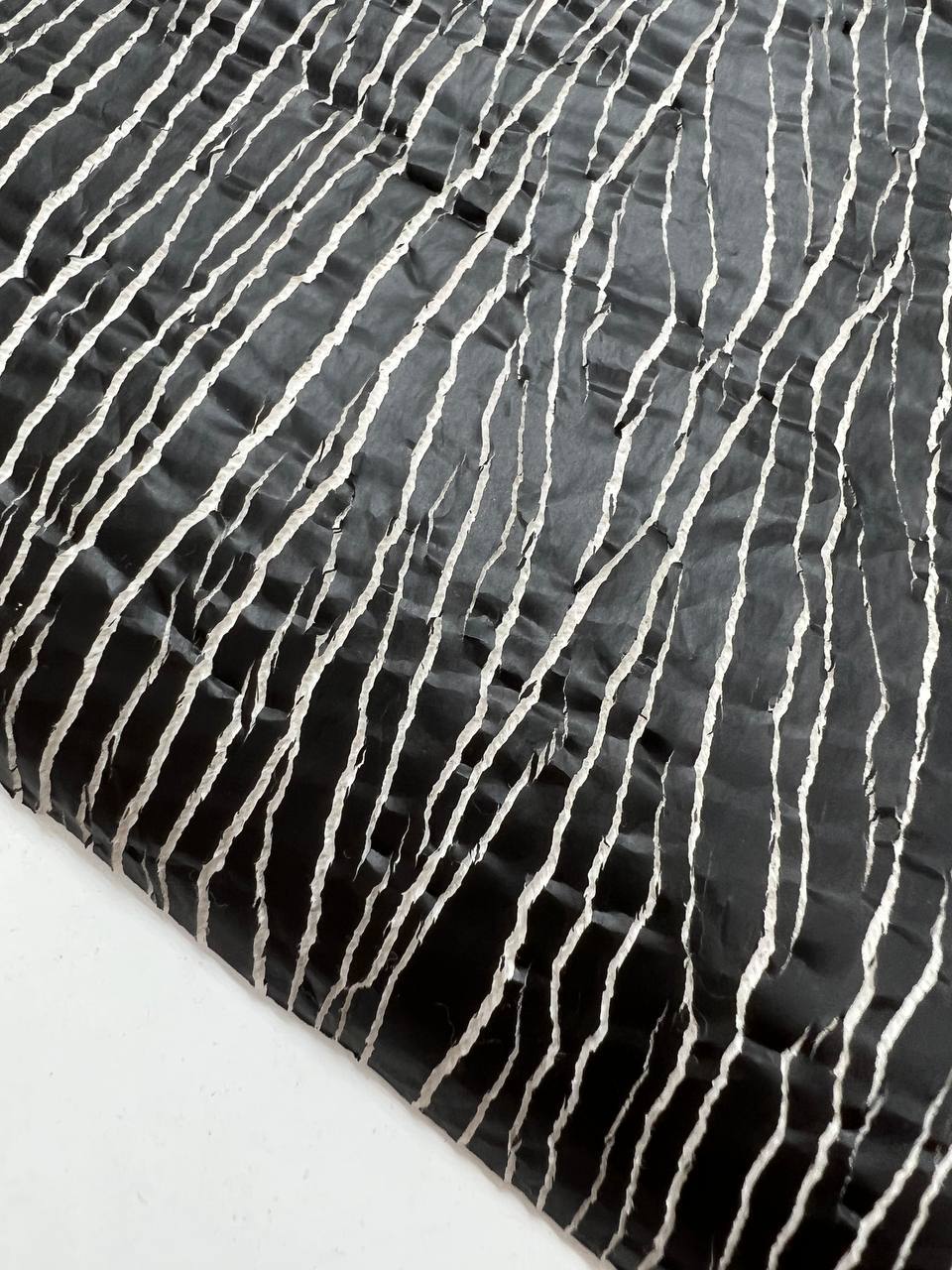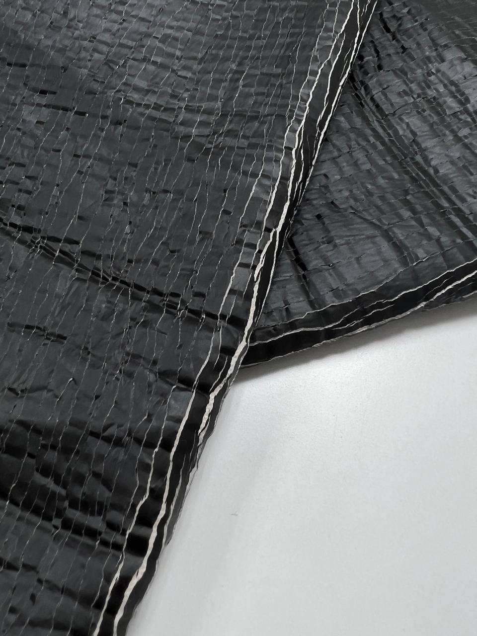 Decorative fabric on a white knitted base (wrong side). When stretched, the front side of the black material begins to tear, opening and making the white side of the base visible;