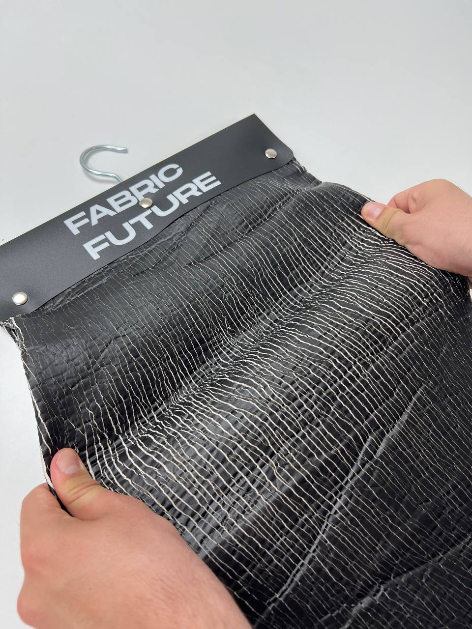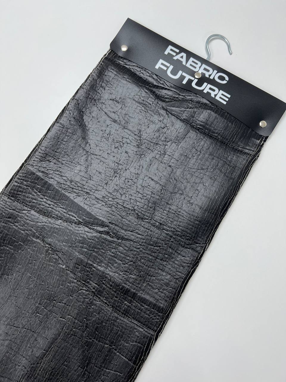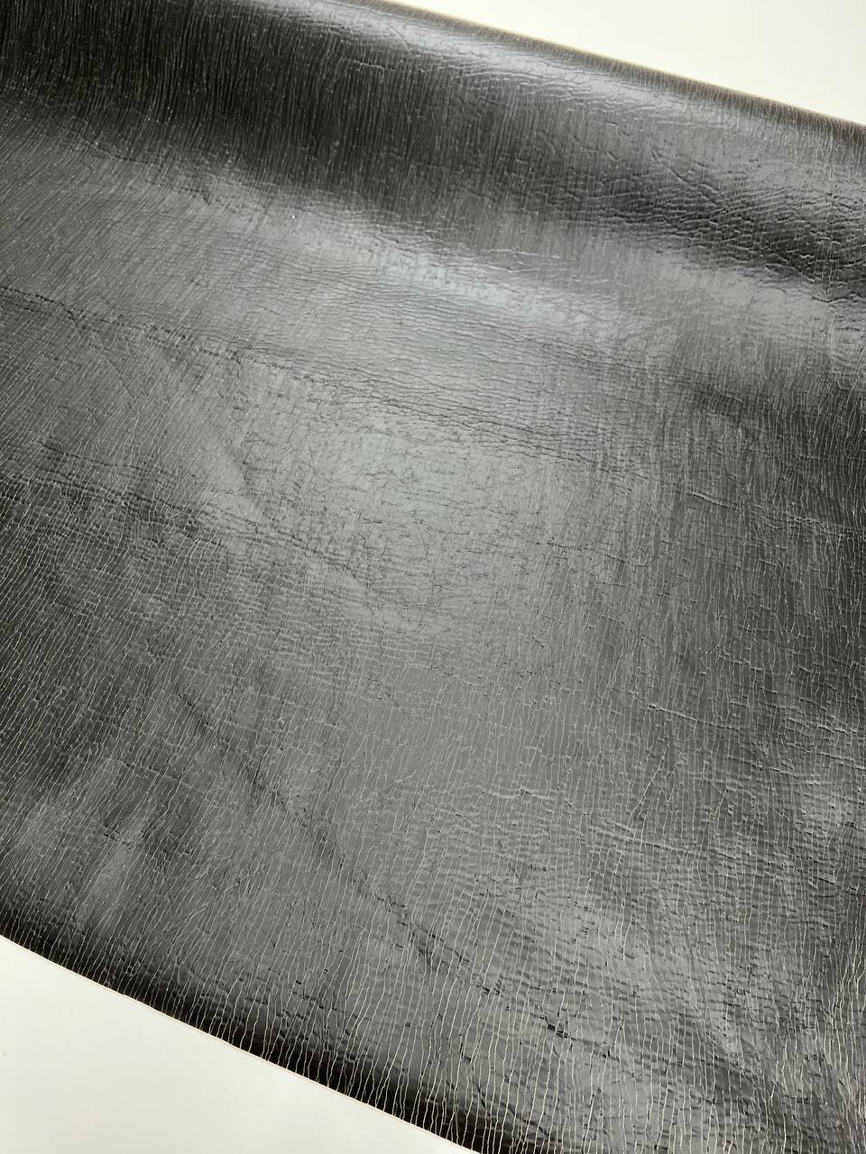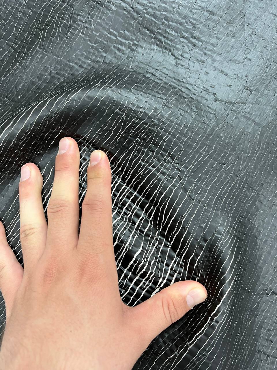 Decorative fabric on a white knitted base (wrong side). When stretched, the front side of the black material begins to tear, opening and making the white side of the base visible;