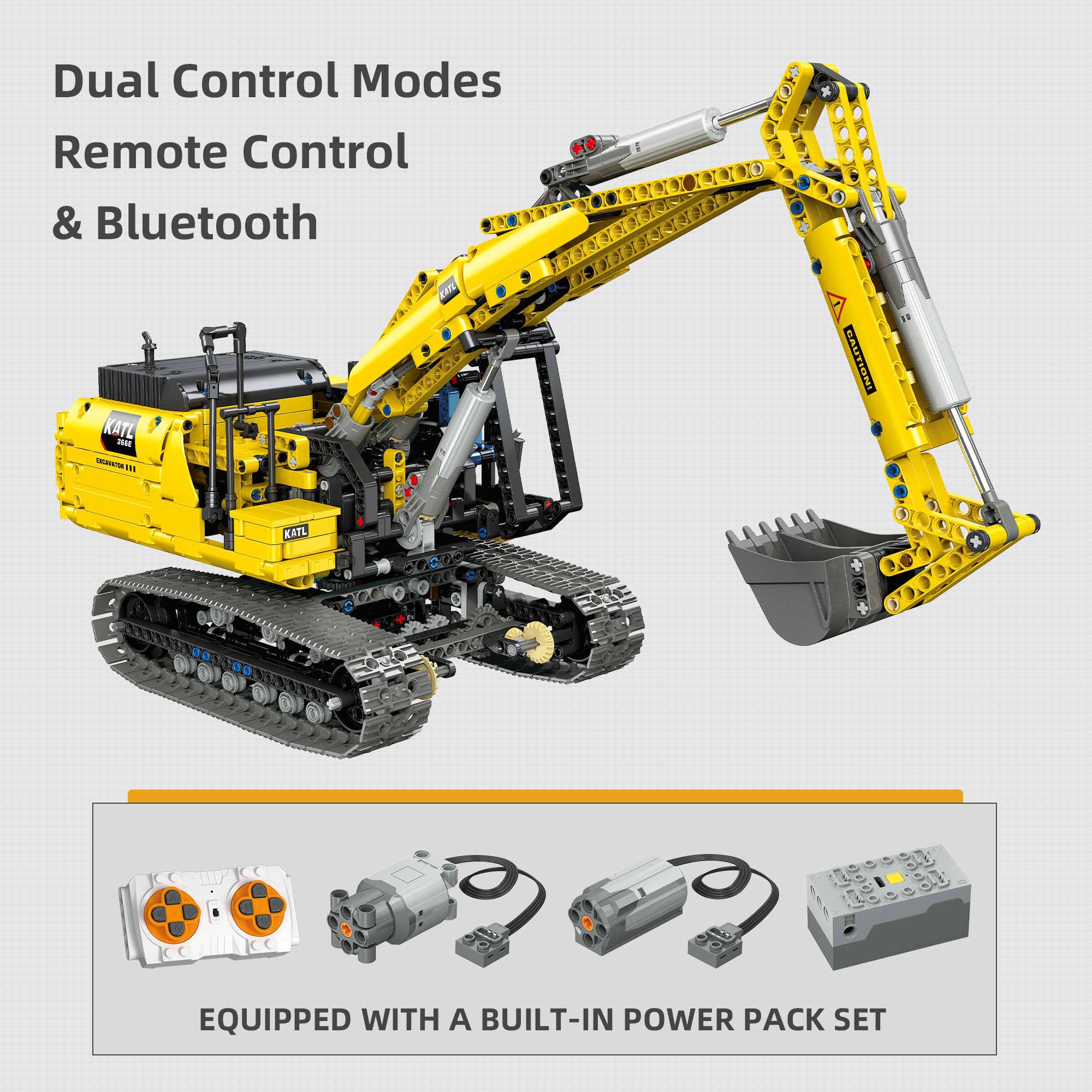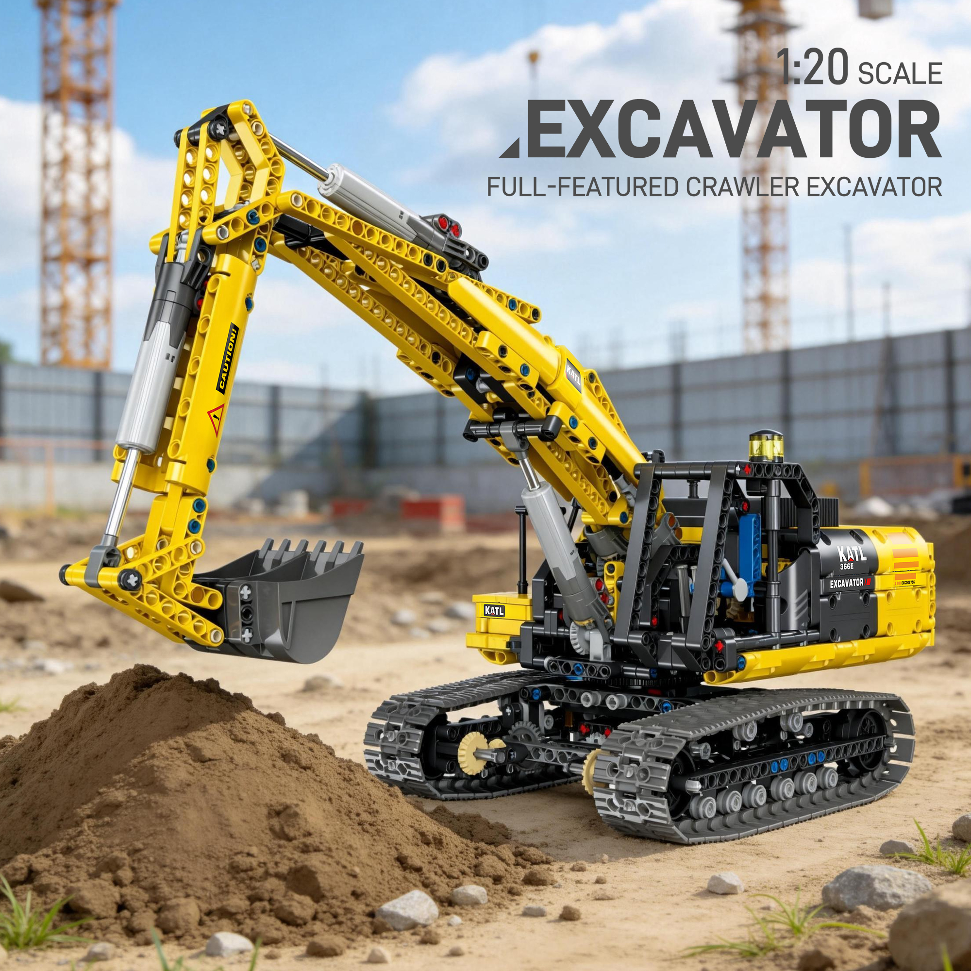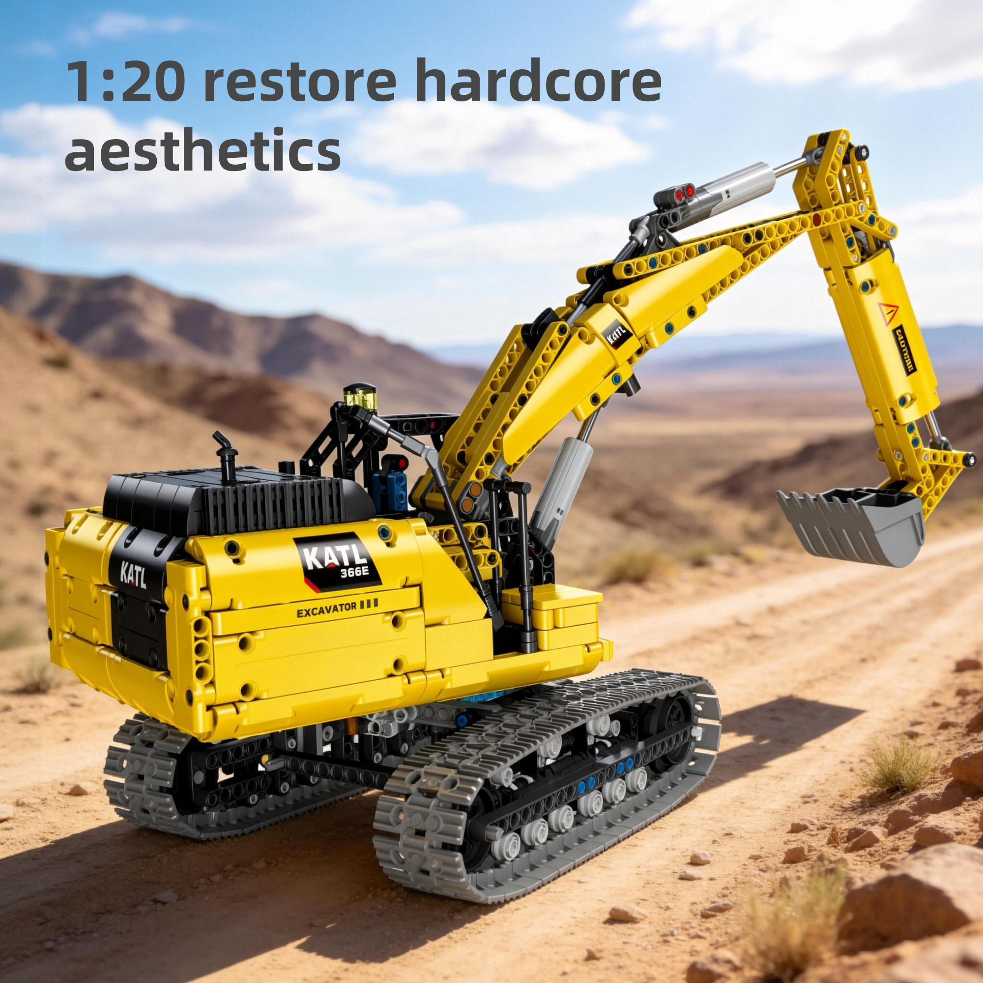 DIY Building Block 1:20 Full-Function Crawler Excavator – Simulates the structure of a real excavator. Equipped with a power kit, it unlocks more ways to play, featuring rich movable mechanical details. Experience the structural logic of construction site operations: the body can rotate 360°, the mechanical boom and arm can swing up and down, and the bucket can be remotely controlled for digging. Immerse yourself in the charm of engineering machinery. Once assembled, it can serve as a unique home decoration piece – an excellent choice for engineering machinery enthusiasts and building block collectors.