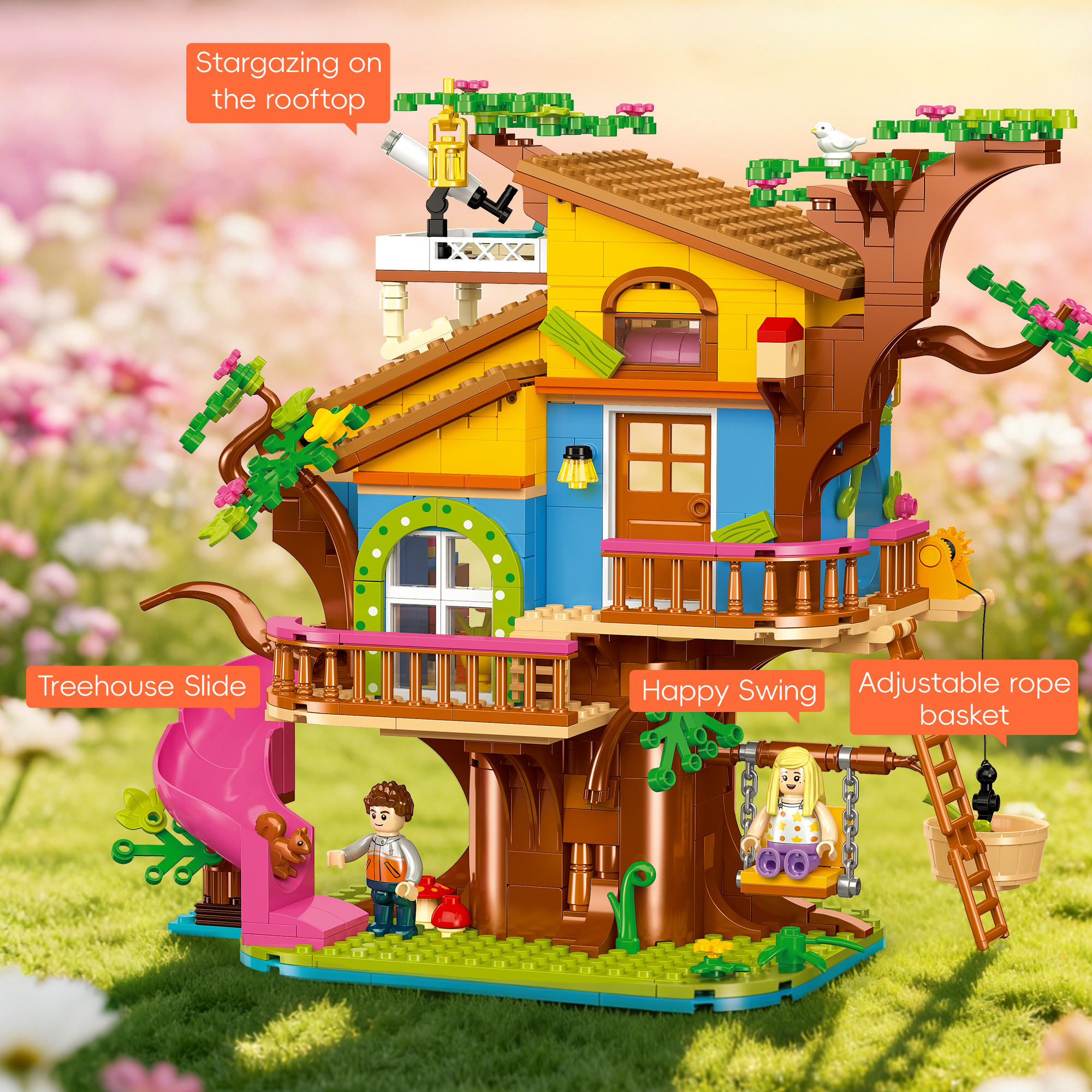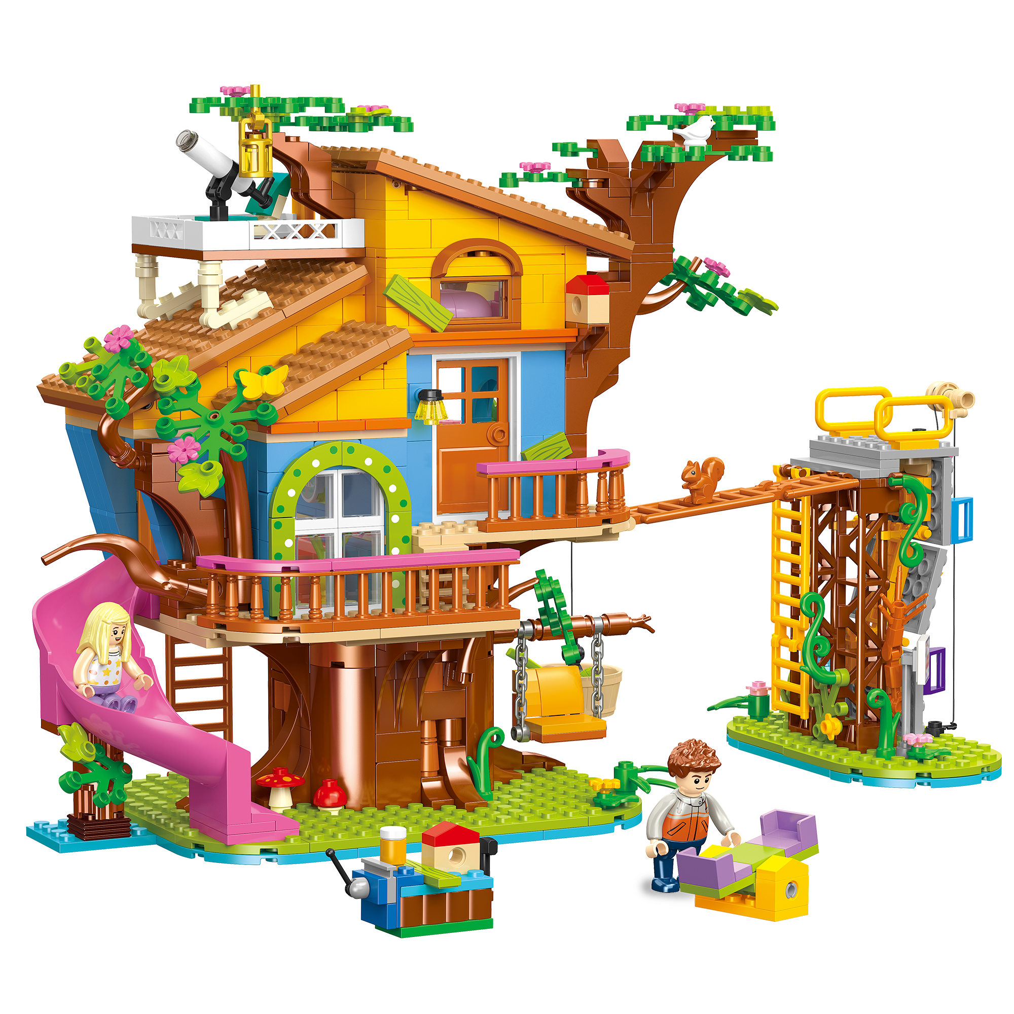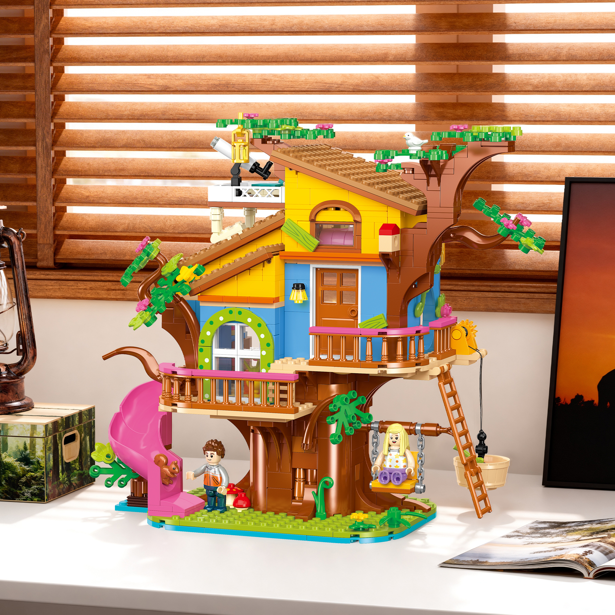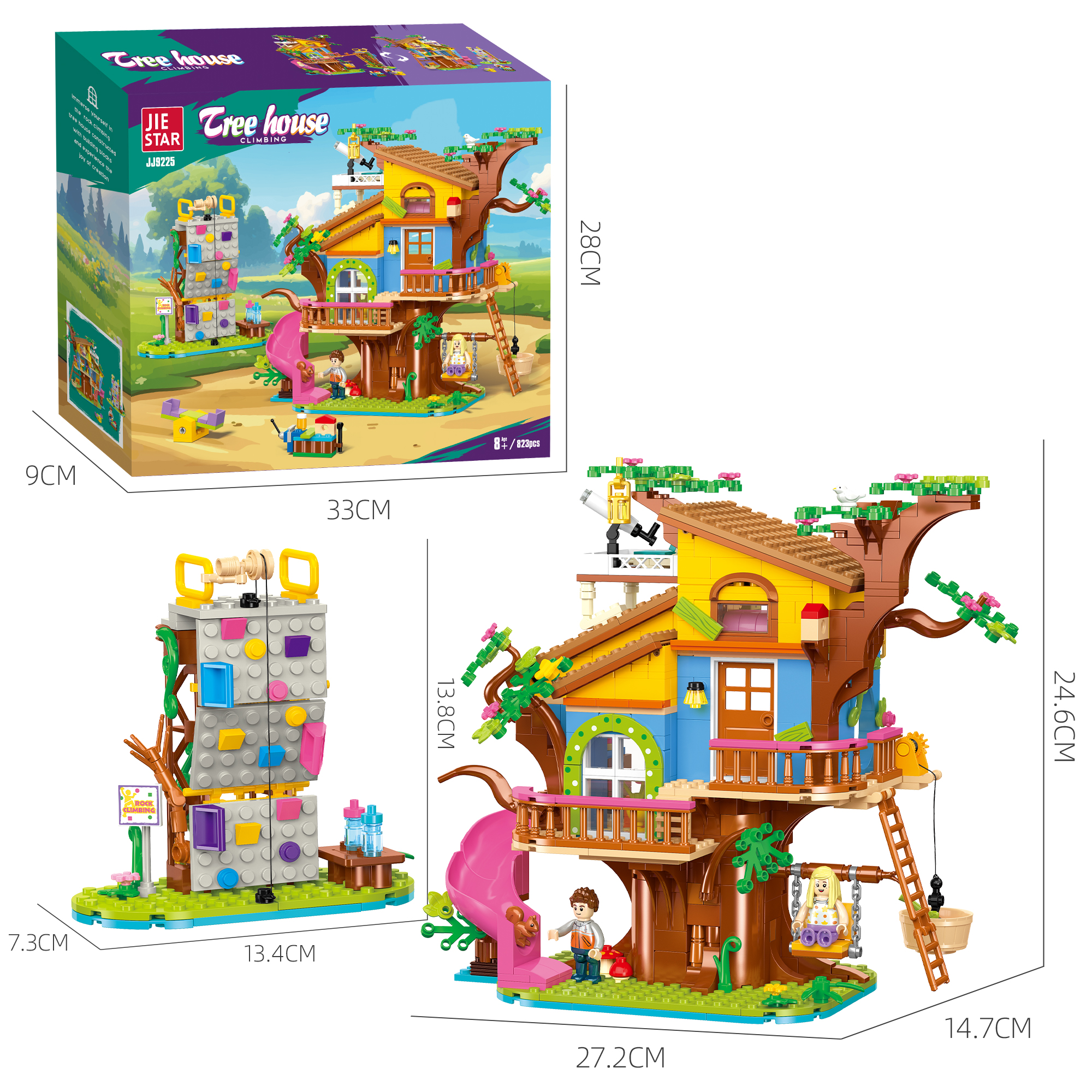 The building block assembly rock climbing wall treehouse street view architectural model features a well-arranged multi-level structure, rich decorative elements, and diverse scenes. Workbench, swing, door, seesaw — multiple movable parts provide endless fun. The treehouse and rock climbing wall can serve as independent scenes or be connected via stairs to form a larger scene, decorating your home and showcasing your personality. It is a highly eye-catching creative ornament.