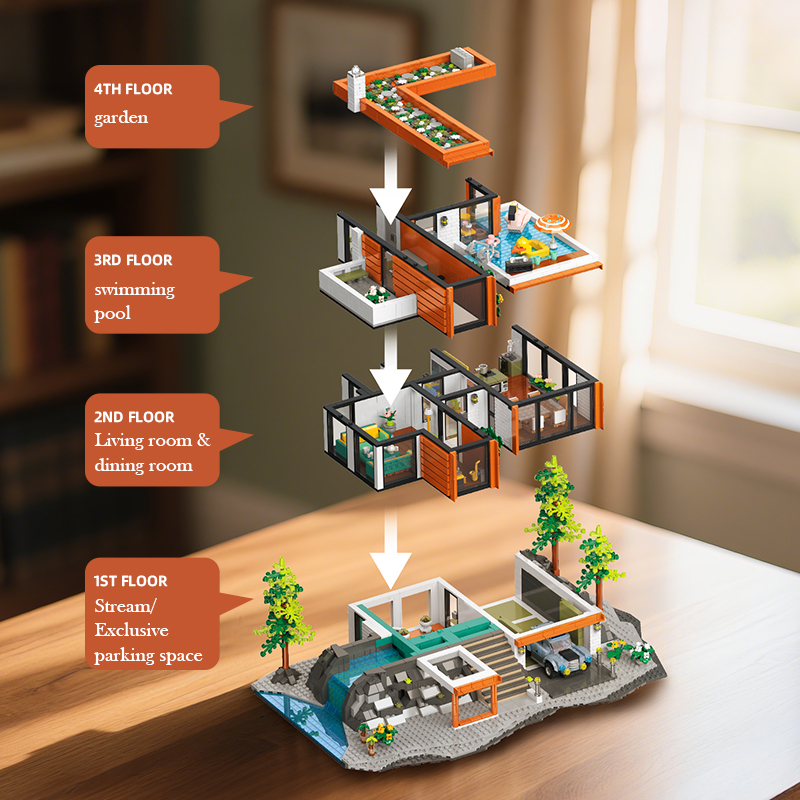 DIY building block simulation villa – stylish and true-to-life in design. Multi-layer assembly with a stable structure, offering a clear view of the interior design and layout. Each floor is detachable, featuring rich details and elements that faithfully recreate the original. Equipped with lighting components, it creates a warm and cozy atmosphere – a piece worth displaying and collecting for both building block enthusiasts and home decor lovers.