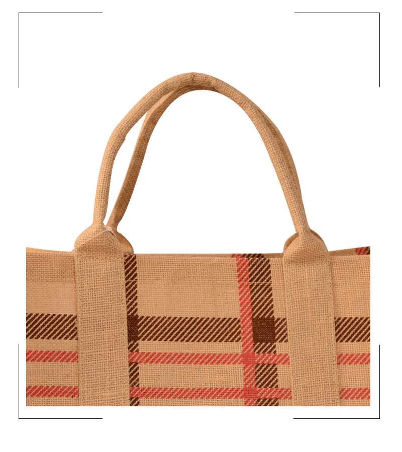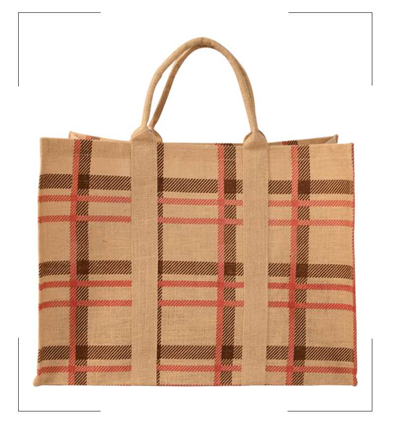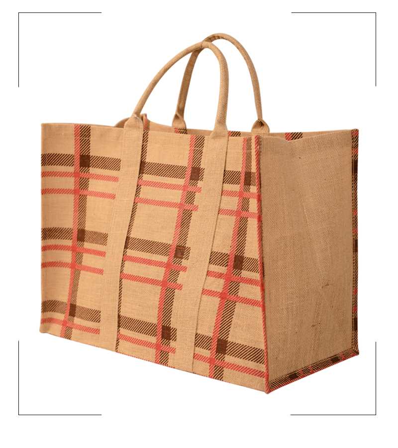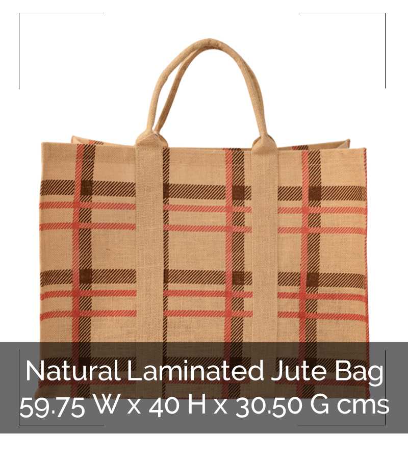 Natural Laminated Jute Oversize Bag with Multi Colour Check Print & Allover Attached Self Padded Handles.