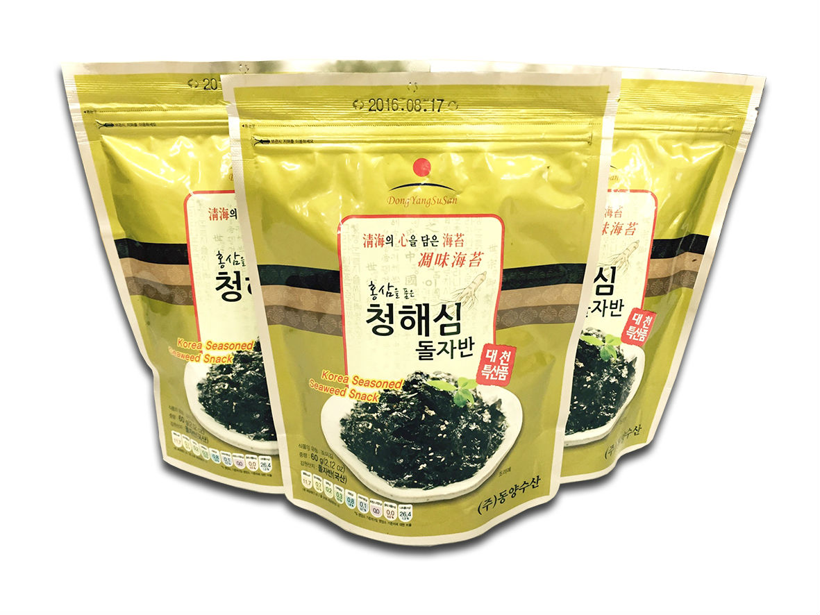 Rock lavers farmed on sea props are cut and roasted with mixed oil(corn oil, sesame oil), sugar and salt fot an appetizingly crispy taste. You can mix it with rice or add it to rice balls for your children's snack. It also harmonizes well with other cuisines or as a snack with drink. Ingredients : seaweed(laver), corn oil, sesame oil, sugar, seasoned salt, powered korea ginseng steamed red. Specipication : 60g per pack Daily Output : 60g * 3,000 packs Others : Box packging of 50 packs and other packging options are available