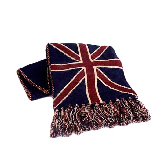 This jacquard knitted scarf features a chic pattern resembling the look of an England flag. It is fabricated from 100% acrylic for warmth. This attractive jacquard knitted scarf in navy and red is finished with fringes.