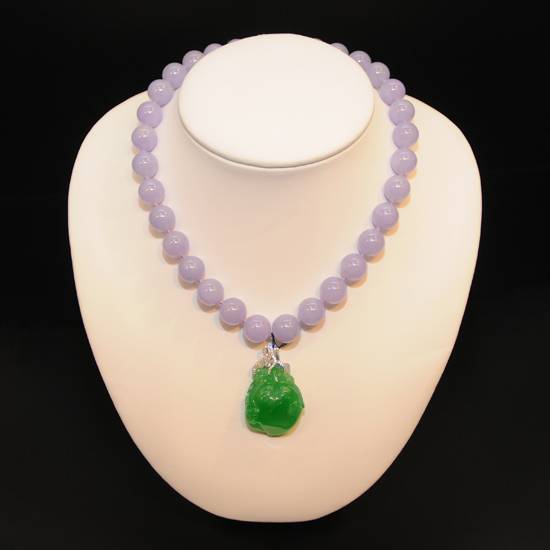 The featured item is a jade bead necklace. It is strung with unique lavender jade beads and a lush green jade pendant with a design of a peach.