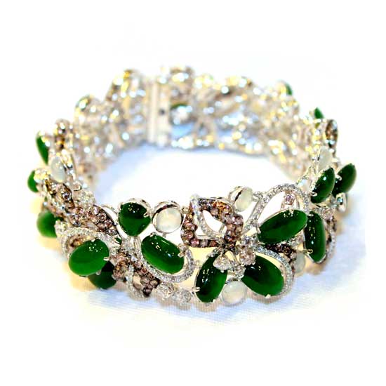 The charming bracelet is paved with ice and green jades and diamonds. It is exquisitely crafted to give a highly polished finish. Embellish your wrist with this gorgeous bracelet.