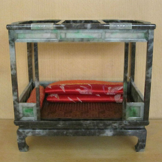 • The base is made with a fundamental tone of black jade, along with rectangular decoration made of greenish purple jade.