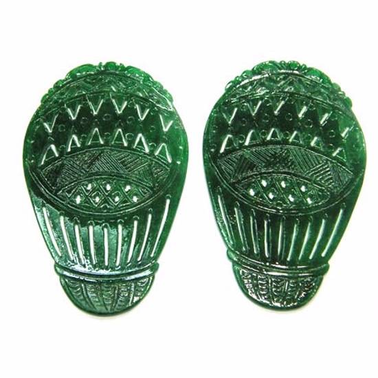 This is a pair of jade carvings which are made of 2 pieces of jade with flat surfaces. The jade pieces are decorated with carvings and engravings.