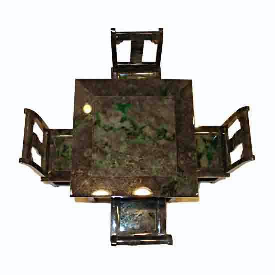 The antique-style dining table set includes a square-shaped table and 4 matching chairs. The beautiful black jade and green jade accentuate your home setting with class and elegance. This dining table set defines the true meaning of uniqueness.