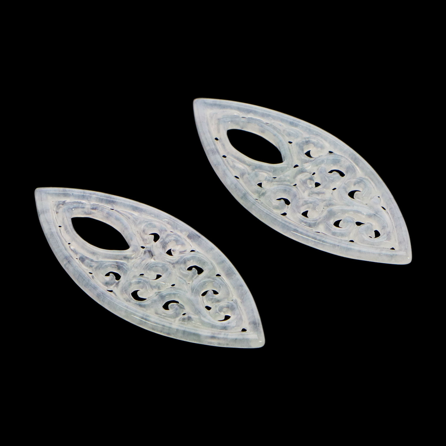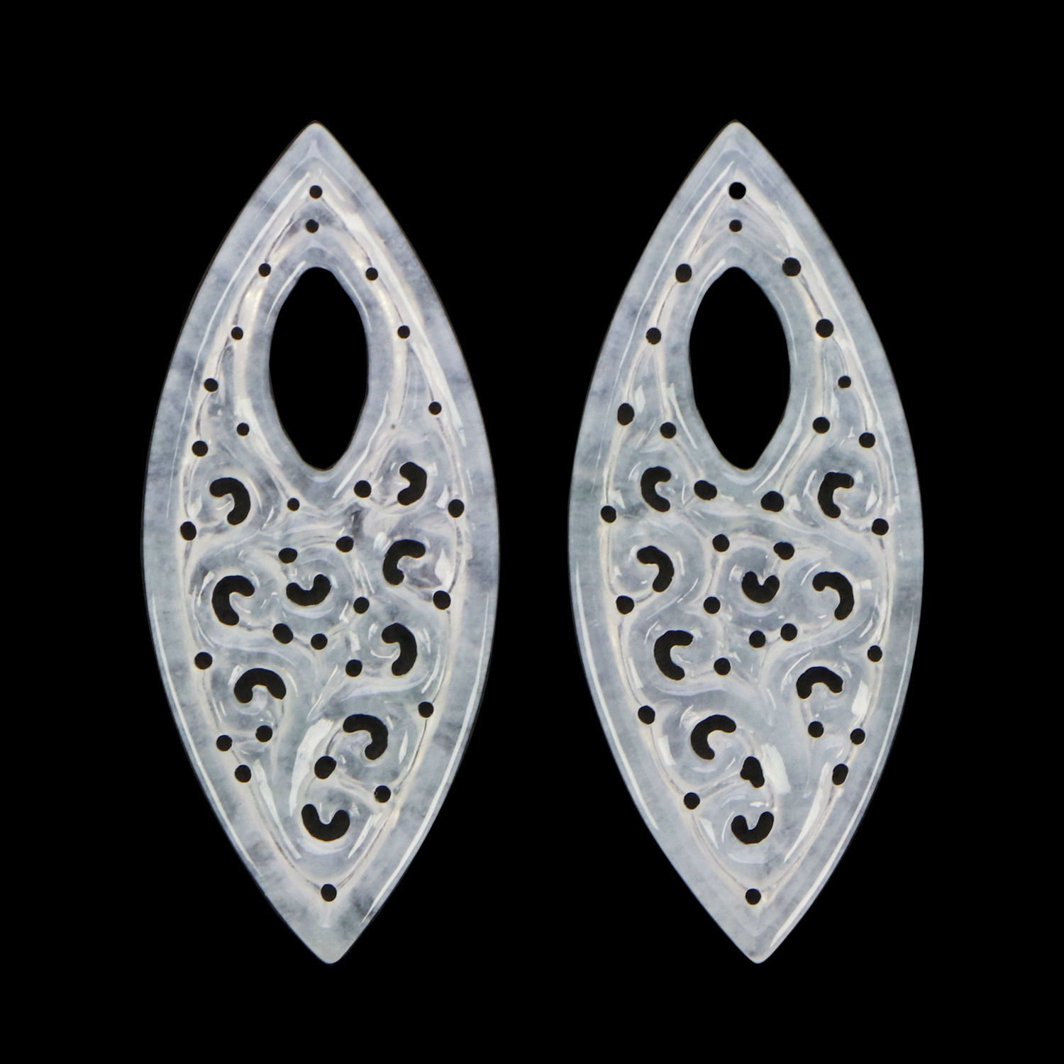 This pair of jade earrings comes in a marquise shape and is embellished with allover swirl patterns. It is handcrafted using natural type A white jadeite jade and has a hole for attaching to earring hooks. The jade earring is finely crafted for a refined look and is a great accessory for matching an elegant style.