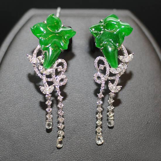 The featured item is a pair of earrings made of jade and diamonds. Each earring features a jade piece at the stud area, in prong setting, while the lower part is a drop chandelier design set with diamonds.