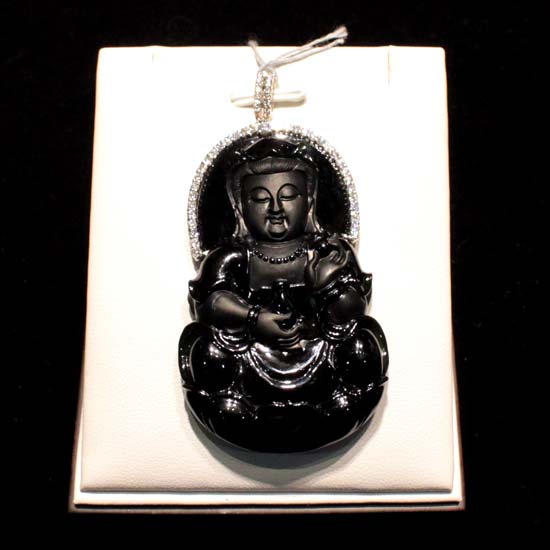 This pendant is made of black jade to showcase the solemn spirit of Guanyin. The Guanyin is presented in a kind expression with great craftsmanship. The diamonds are added as a sparkling finish to the necklace.