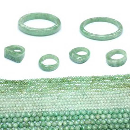 As shown are jade jewellery including jade bangles, jade rings and jade beads. They are light green in colour. The jade beads are suitable for making jewellery such as necklaces, bracelets, earrings, etc.