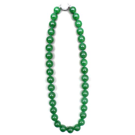 This is a single strand necklace of jadeite beads. The necklace is made of 35 graudated jadeite beads of translucent bright emeral green material. Attached to a 18k white gold clasp with white diamonds.