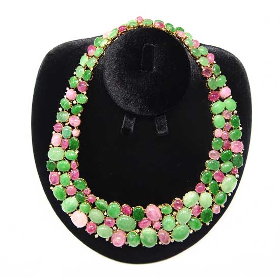 This outstanding necklace is crafted with detailed workmanship. It is adorned with jades, pink sapphires and rubies for a gorgeous, opulent look. You will surely look more sophisticated with this brilliant jade necklace.