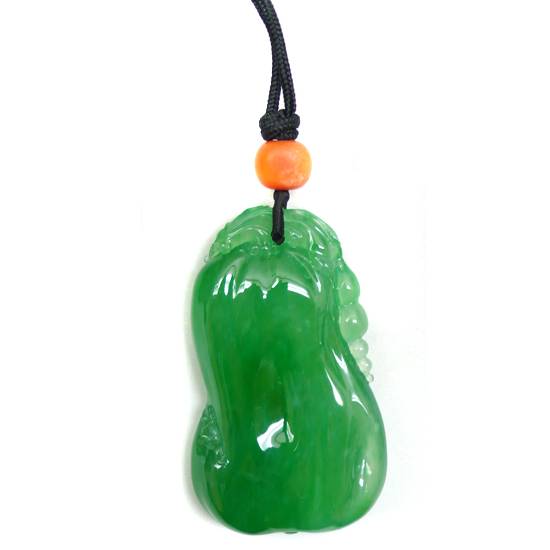 This is a jadeite pendant designed with a figure of gourd. The well carved pendant features a jadeite in intense emerald green colour and high to glassy translucency. It comes with a piece of orange coral bead.