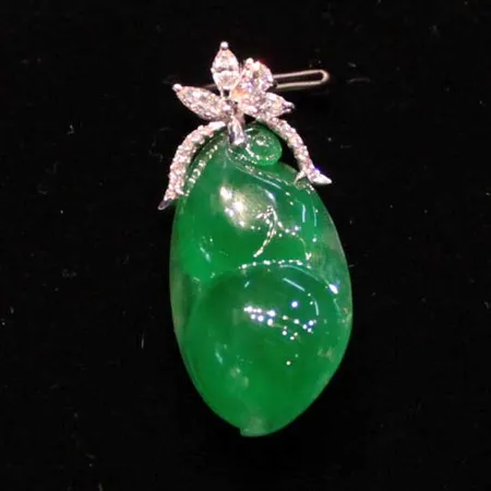 This jade pendant comes with a frame made of high-quality 18K white gold set with diamonds. The jade is delicately carved in an oval shape. This dazzling jade pendant is remarkable for matching with your evening dresses.