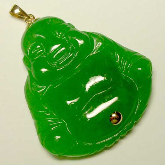 Featured here is a Buddha pendant in a sitting posture. The jade pendant is finely carved and polished. The 14k gold casting ensures long-lasting beauty.