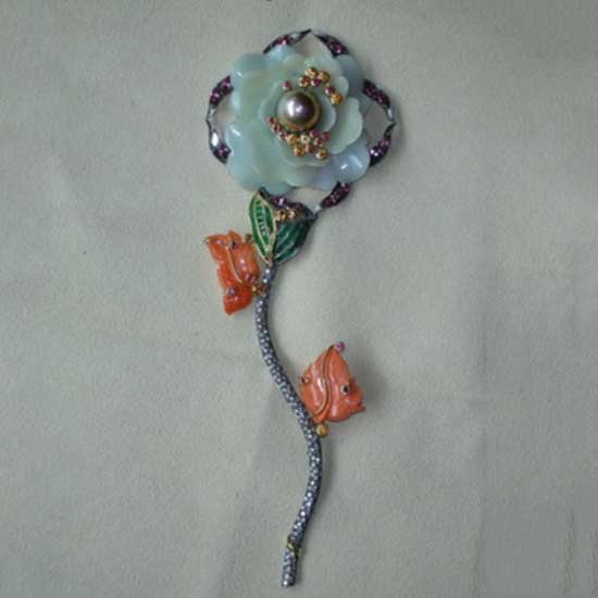 Highlighted is a Chinese-style peony carved layer by layer from lustrous green jade. Emerald bud and momo-coral leaves make the blooming green peony fashionable. The pistil is decorated with colorful pearls and yellow sapphires, appearing as drops of dew on the petals.