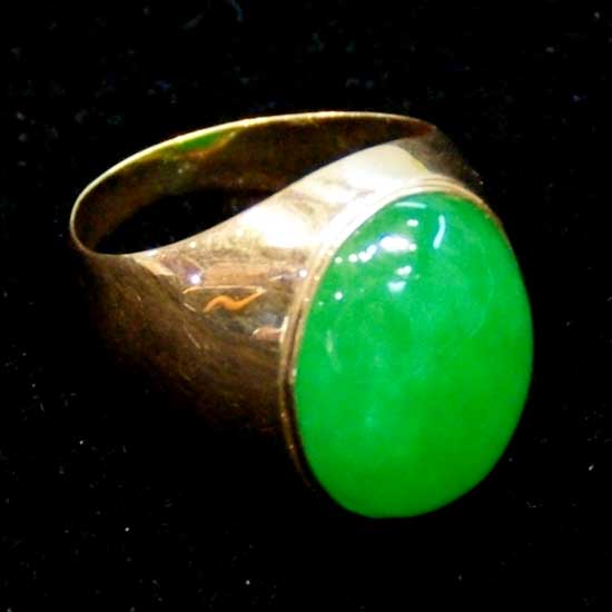 The fabulous jade ring features a piece of protruding oval jade in a remarkable size, which is of translucent green with excellent luster. The band comes with a considerable width in a matt golden color, veiling fine narrow lines. The dashing design appeals to both men and women.