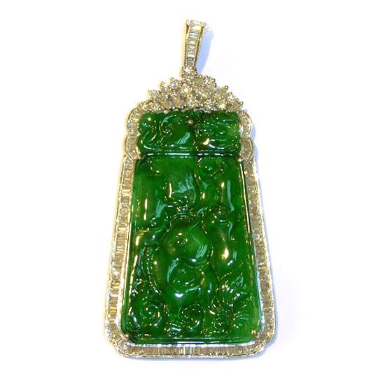This is a trapezoid shaped jade with diamond and 18k white gold pendant. The pendant has an irregular embossed pattern of jade embellished with sparkling diamonds. It can easily match with various types of chains to form a necklace.