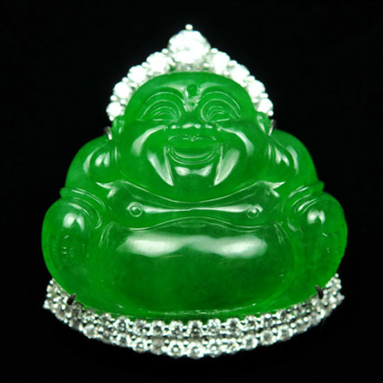 This jadeite pendant features a pleasant shape of a laughing Buddha. The rich emerald color and good transparency of the jadeite are pleasing to the eye. This fine jadeite pendant delights your look with oriental charm.