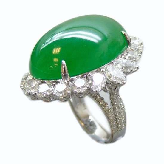 This jadeite ring is mounted in a bezel setting of a diamond band. The stunning look can go with any style. This beautiful jade represents purity and grace. It also promotes health and good fortune.