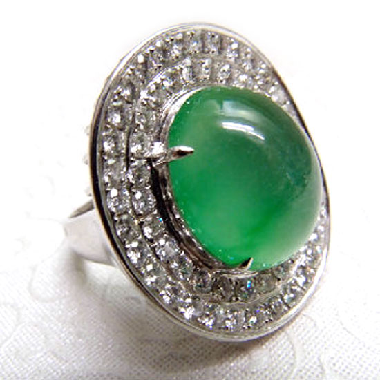 This is a stunning finger ring that boasts a blue natural jadeite cabochon in the center. The allover dazzling diamonds add a glamorous touch to the whole piece. This finger ring shimmers with a highly glossy finish.