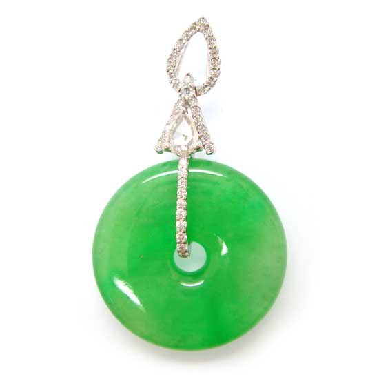 This is a jadeite disc pendant with an exquisite and dainty appearance. The round jadeite disc comes in bright green with good translucency. It is completed with an 18K white gold mounting which is decorated with a pear-shaped rose-cut diamond and paved with various round-cut diamond elements for a perfect finish.