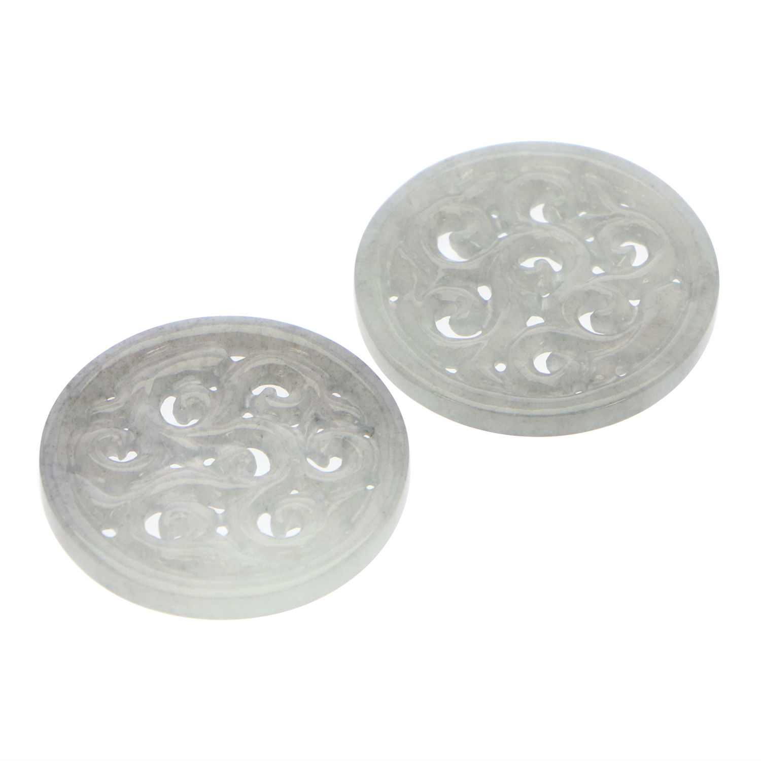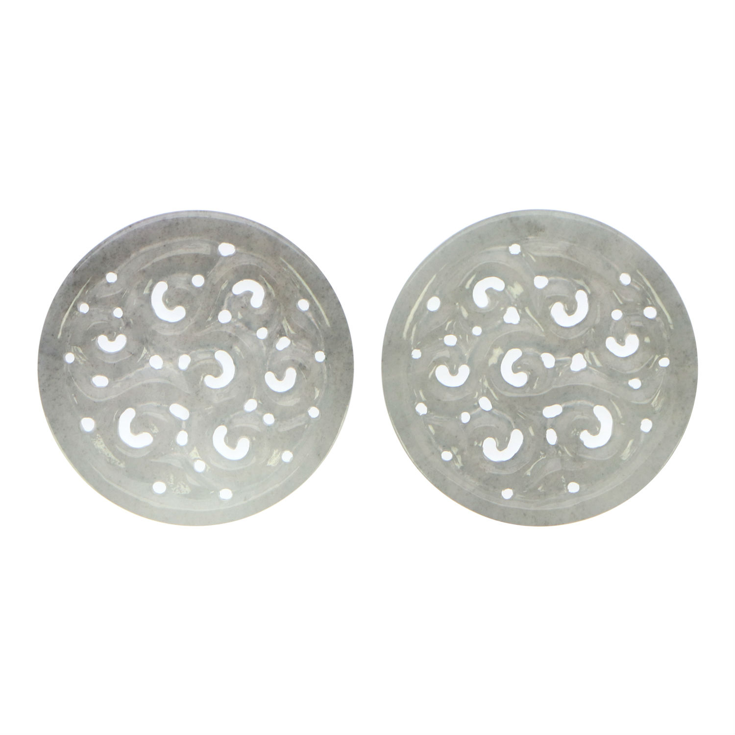 This pair of earrings is handcrafted using natural type A grey jadeite jade and is embellished with oriental swirl patterns. The earrings come in round shape and has holes for attaching to earring hooks. They flaunt skillful workmanship and are perfect as a gift for ladies.