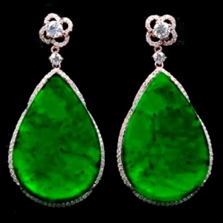 Highlighted is a pair of jadeite earrings that is crafted with great details. The drop-shaped earrings are surrounded by brilliant-cut diamonds for a touch of sophistication. This pair of jadeite earrings is a great choice for formal occasions.