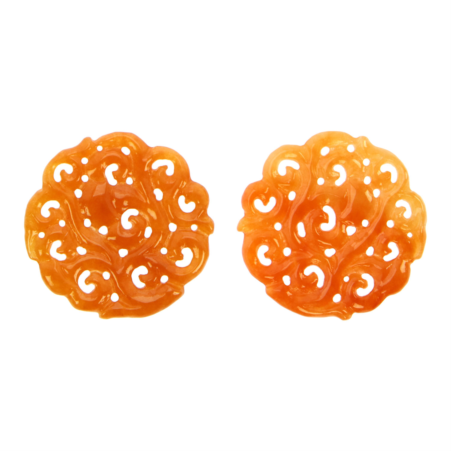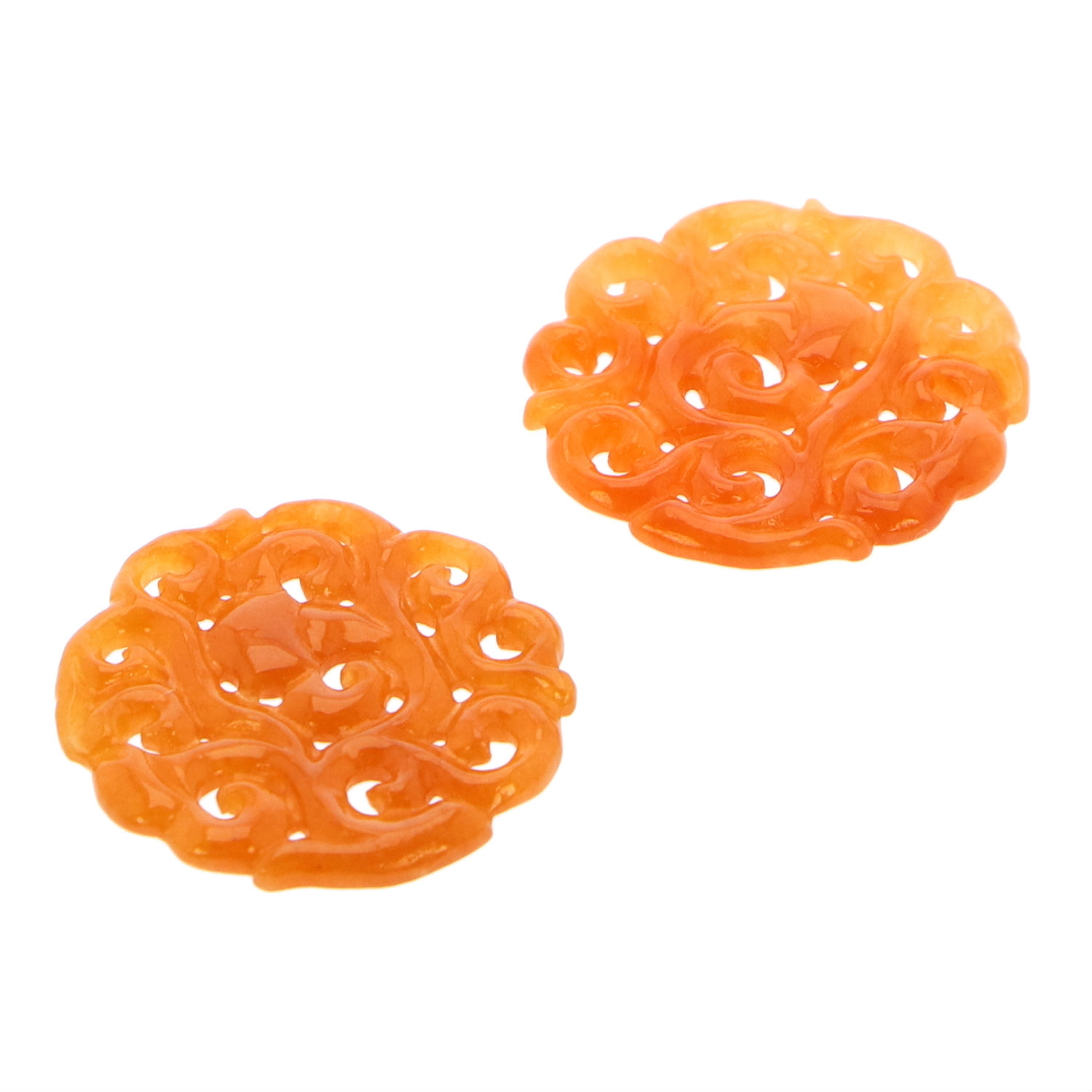 Intricately arranged swirl carvings formed an imperfectly perfect round-like shape in this pair of orange jadeite jade earrings. Handcrafted from natural type A orange jadeite jade mined in Myanmar, this pair exudes a lustrous glow and varying shades of orange that elevate all nocturnal edits. Its exquisite craftsmanship also renders it an excellent accessory to include in fine jewelry collections. Inject a dash of everlasting glamour and grace into your curation with these elegant and refined earrings.