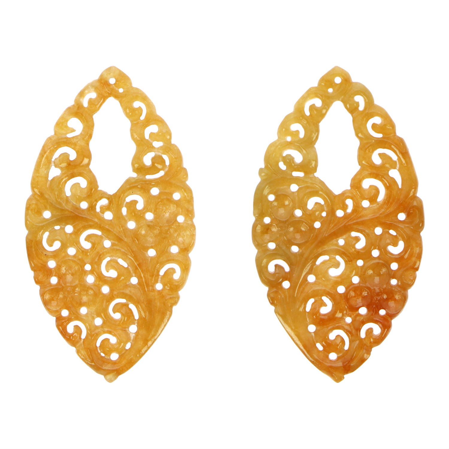 Sculpted in a feminine and sophisticated marquise shape, these jadeite jade earrings are crafted with delicate and beautiful swirl carvings for an exquisite and tasteful appeal. These orange jadeite jade earrings also deliver vibrant hues and a luminous glow that enhance various ensembles with a pop of color. Elevate nocturnal edits with this refined and luxurious pair.