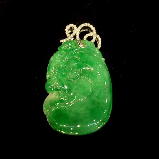 The jadeite jade pendant is finished with delicate carving. It appeals to you with its strong sheen and verdancy. The clasp of this piece is also constructed of white gold and trimmed with splendid diamonds.